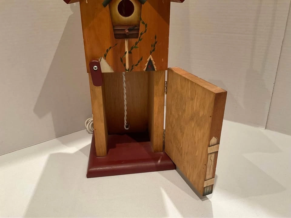 Charming accent table lamp with a cute birdhouse design and a little red cardinal on top. Painted details include smaller birdhouses, vines, and a fence with a 'Garden Welcome' sign. Great condition, from a smoke-free, pet-free home. Located in Richmond Hill (Bathurst & King Rd).