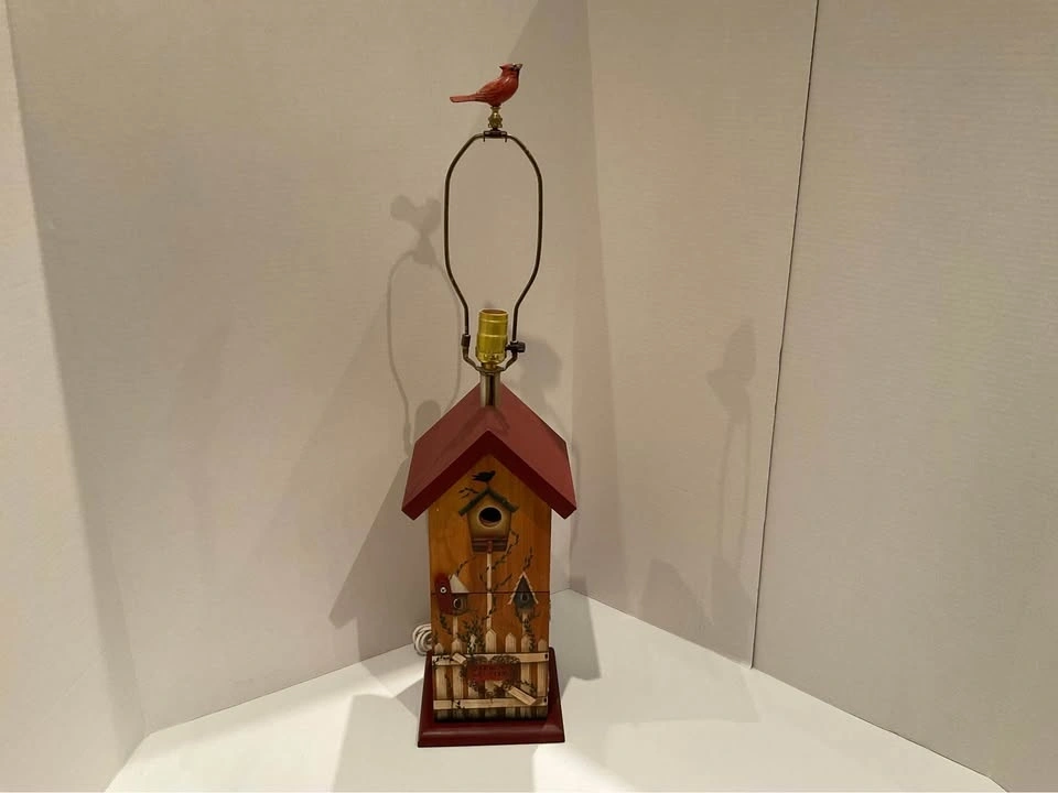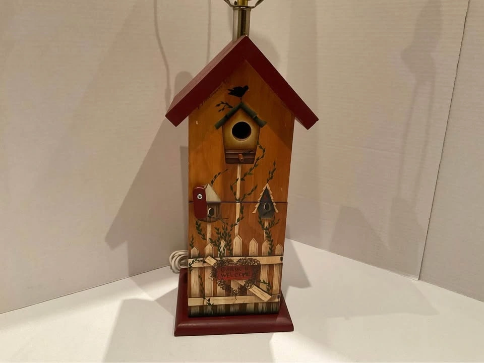Charming accent table lamp with a cute birdhouse design and a little red cardinal on top. Painted details include smaller birdhouses, vines, and a fence with a 'Garden Welcome' sign. Great condition, from a smoke-free, pet-free home. Located in Richmond Hill (Bathurst & King Rd).