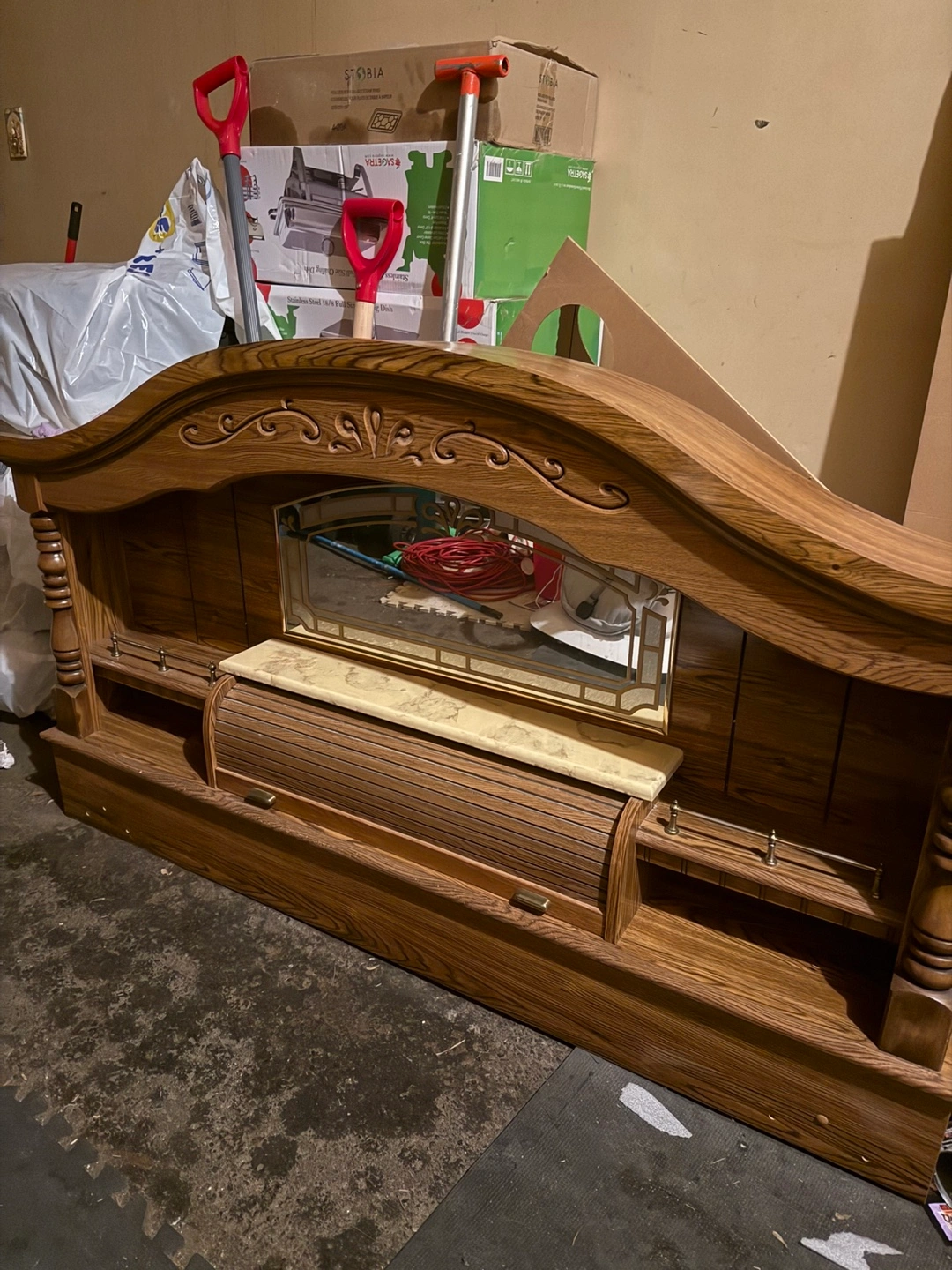 This is a solid wood headboard with a built-in mirror and storage compartment. It has a unique design and is made of wood. It would be a great addition to any bedroom! In Nepean/ Barrhaven.