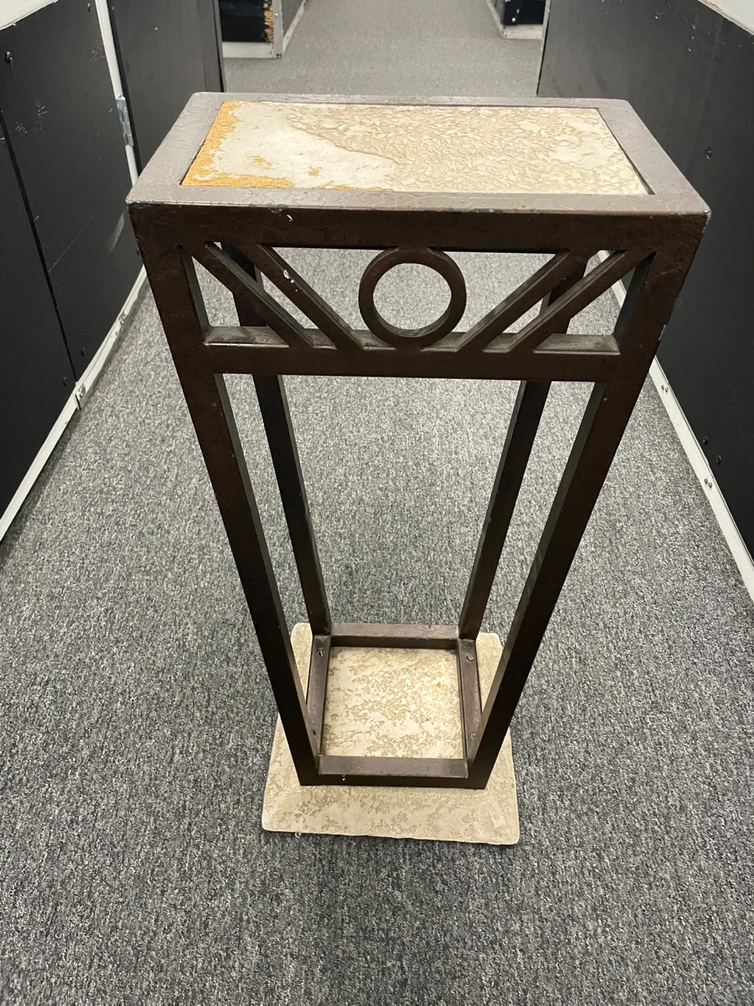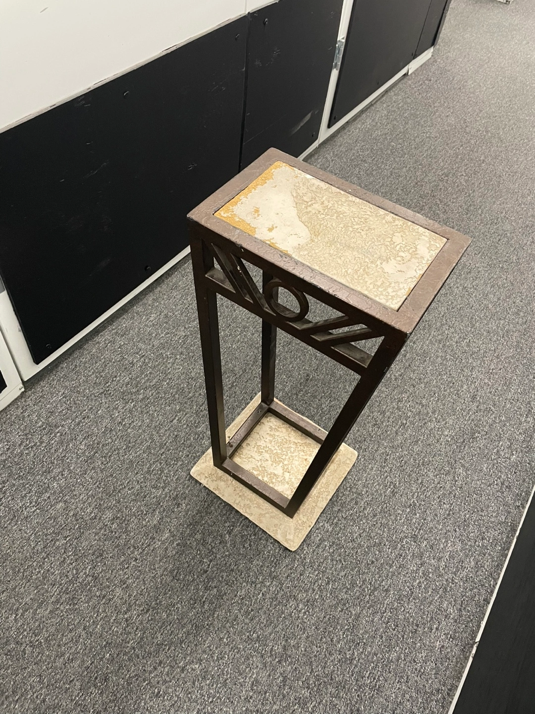 295This is a metal plant stand with a stone top. It has a decorative design and a sturdy base. Perfect for adding a touch of elegance to your home decor