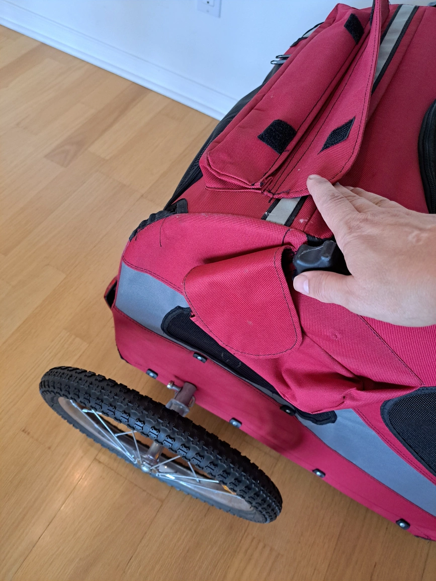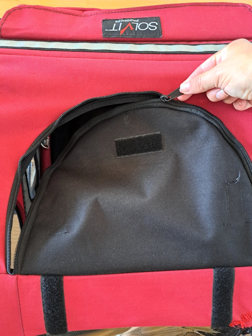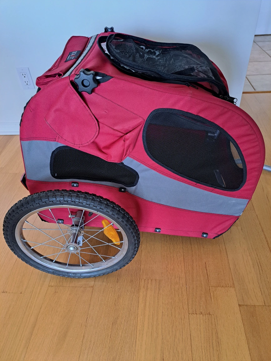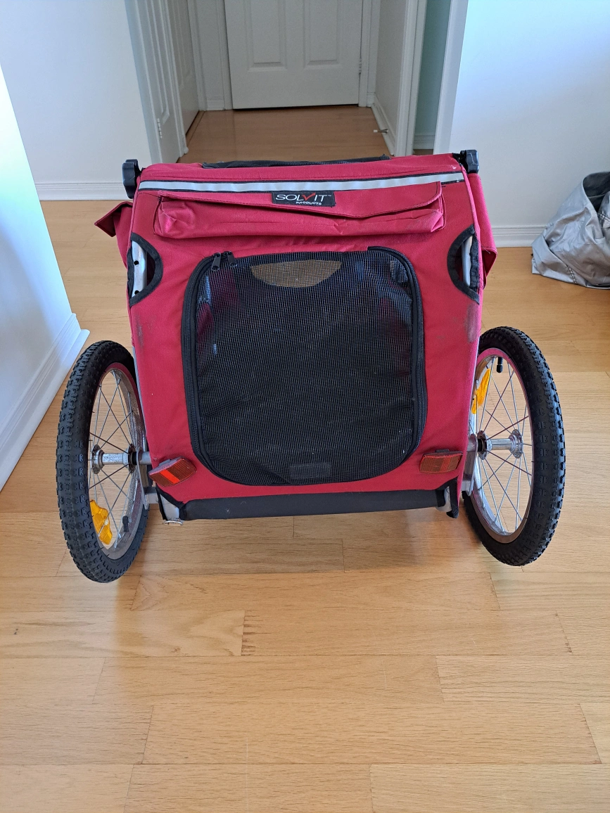 Selling a Solvit pet bicycle trailer in red. It's perfect for taking your furry friend on bike rides. The trailer is in good condition and ready for its next adventure!