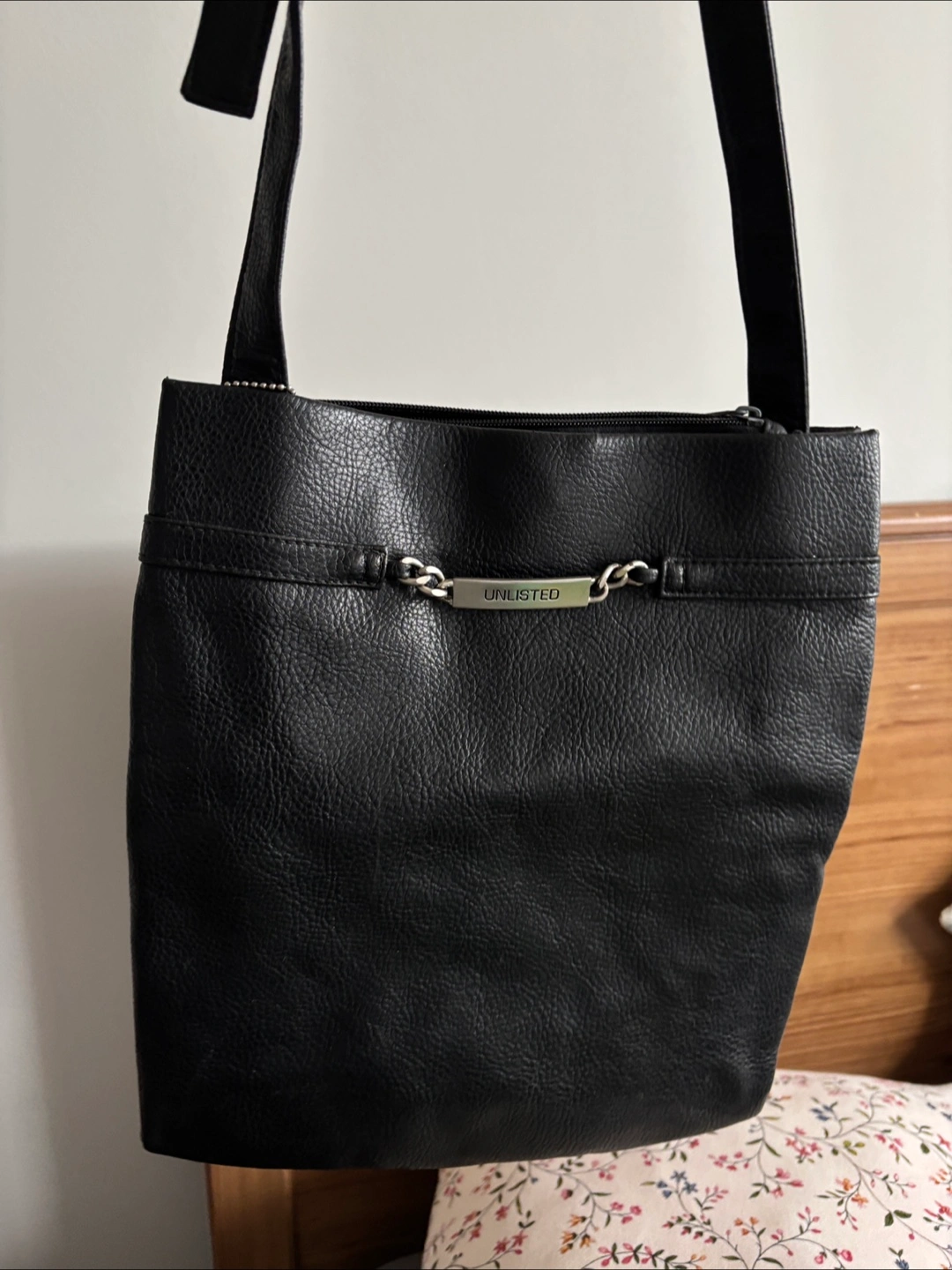 This is a stylish black crossbody bag from Unlisted. It's in great condition and ready for a new home! The bag features a zipper closure and a comfortable strap for easy carrying