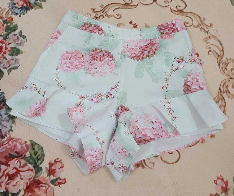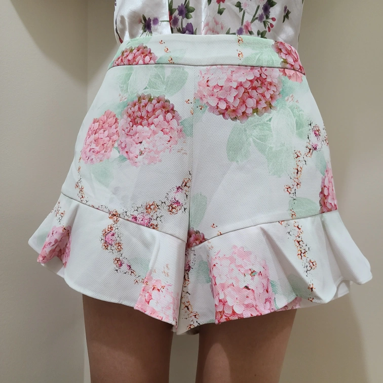 These shorts feature a lovely floral print and a cute ruffle hem! There are pockets and zippers on the side to easily take on and off! Great for spring and summer!