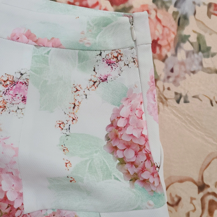 These shorts feature a lovely floral print and a cute ruffle hem! There are pockets and zippers on the side to easily take on and off! Great for spring and summer!