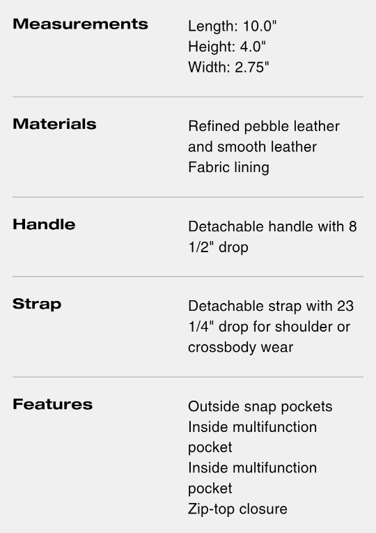 - Detachable strap with 23 1/4" drop for shoulder or crossbody wear
