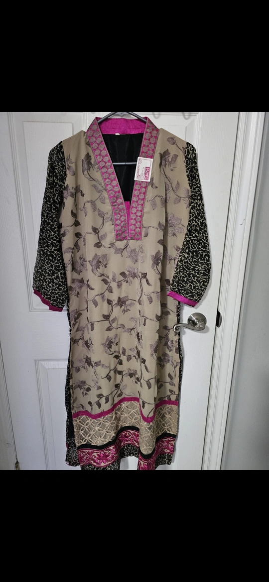 67Here's a lovely Savya kurti in a beige and black floral pattern! It features a stylish design with pink accents around the neckline and hem. Perfect for adding a touch of elegance to your wardrobe