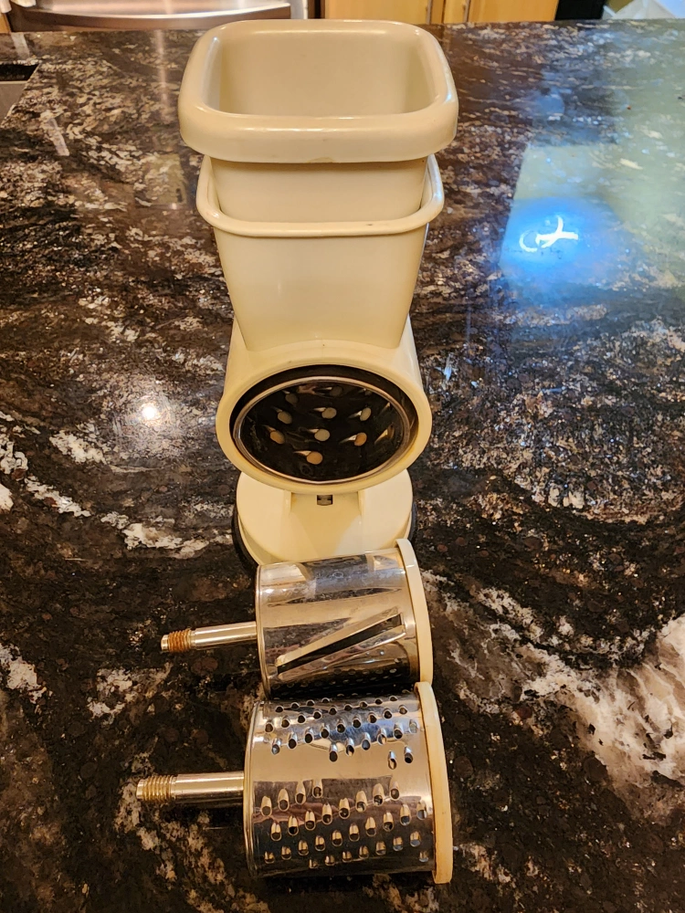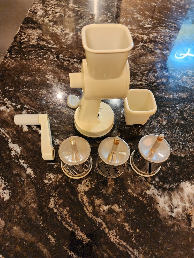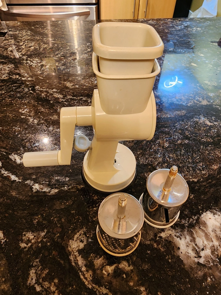 931Selling a Mouli grater! It comes with multiple attachments for different grating and slicing options. Suction pressed to counter so it doesn't slip and side. This classic kitchen tool is in great shape and ready for a new home. 3 size grater attachments. Perfect for shredding cheese, ginger, carrots, etc.