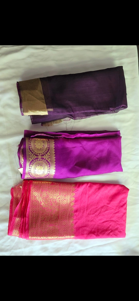Selling three beautiful Indian saree blouse set.. One is a deep purple with a gold border, another is magenta with a gold patterned border, and the last is bright pink, also with a gold patterned border. They are brand new and ready for a new home!