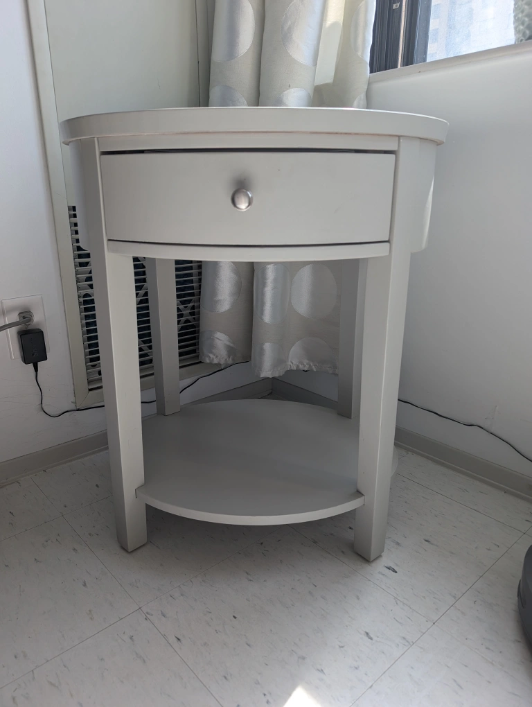 Selling a cute grey round side table! It has a handy drawer and a shelf at the bottom for extra storage. It's in great shape and would look lovely in any room