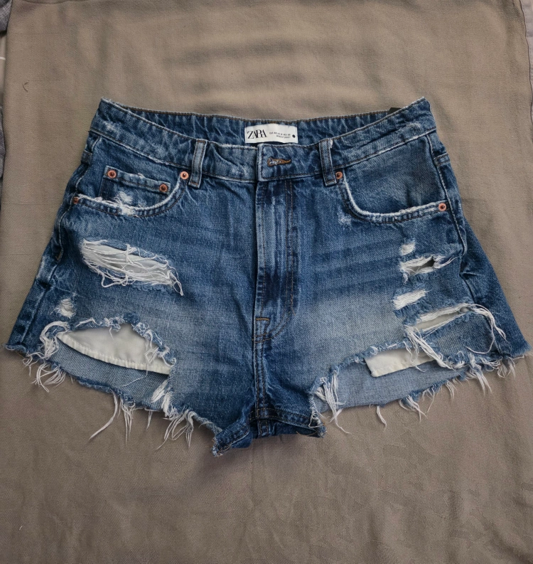 Selling this Zara distressed denim shorts. They're in great condition and have a cool, edgy look with the ripped and frayed details. Perfect for a casual summer outfit!
