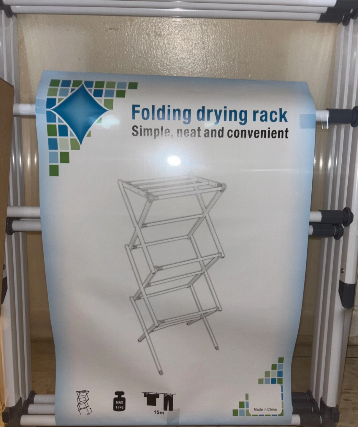 Selling a folding drying rack that's simple, neat, and convenient! It can hold a maximum weight of 15kg and provides 15m of drying space