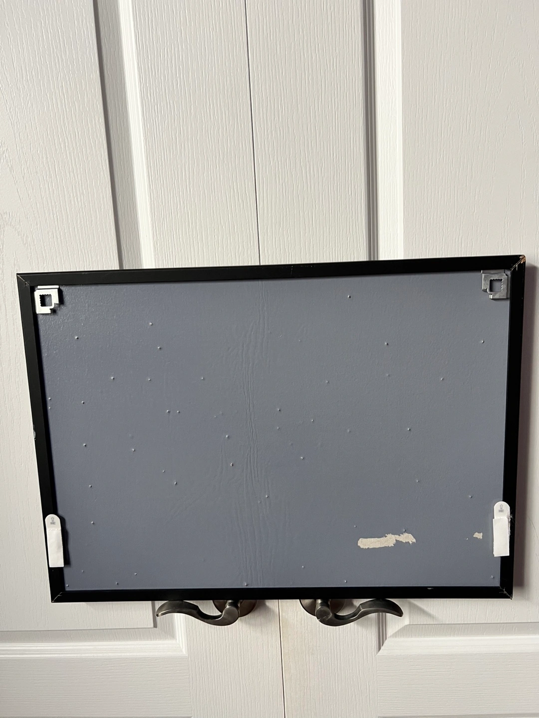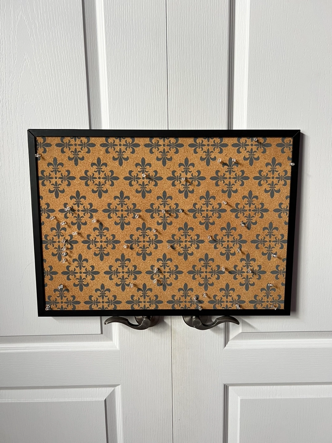 Selling a decorative cork board featuring a fleur-de-lis pattern. It has a black frame and comes with push pins. Great for organizing notes or displaying photos in your home or office!