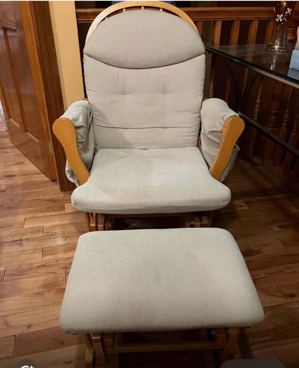 A comfortable glider rocking chair with a matching ottoman. It features a light-colored cushion and a wooden frame. Perfect for relaxing!