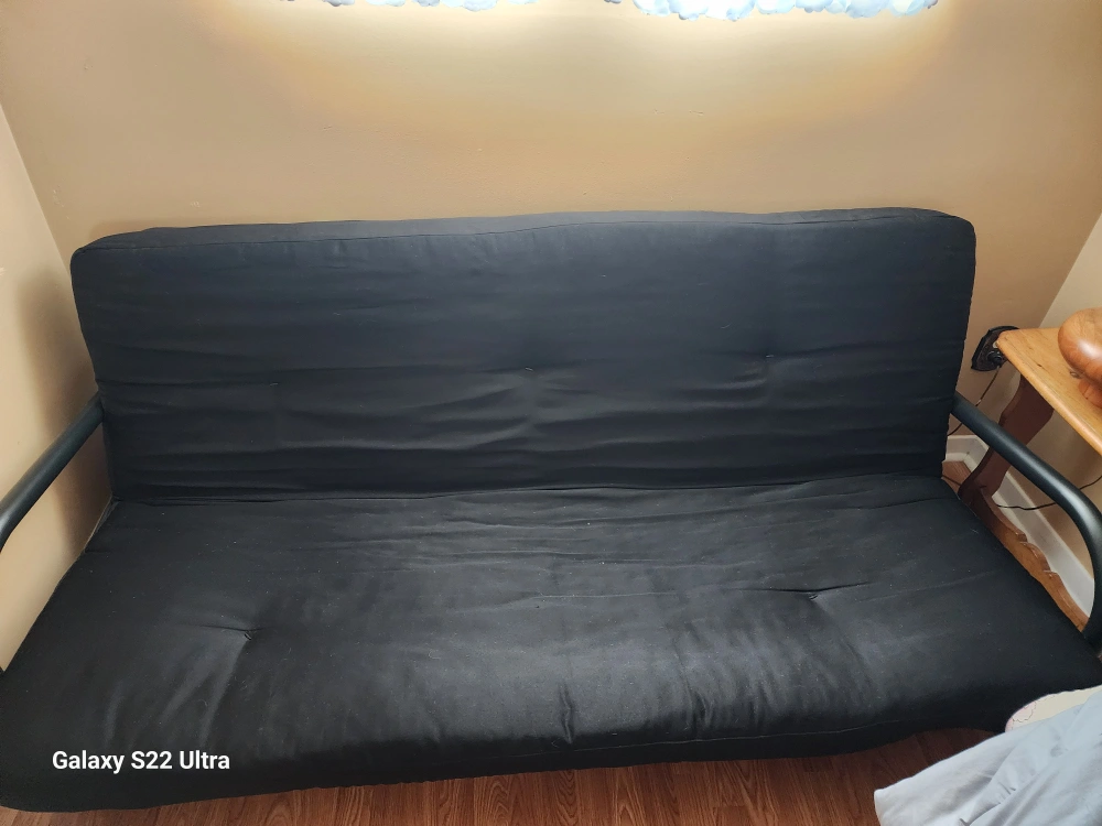 Selling a black futon sofa bed. It's in good condition and would be great for a living room or spare room. Perfect for lounging or accommodating guests!