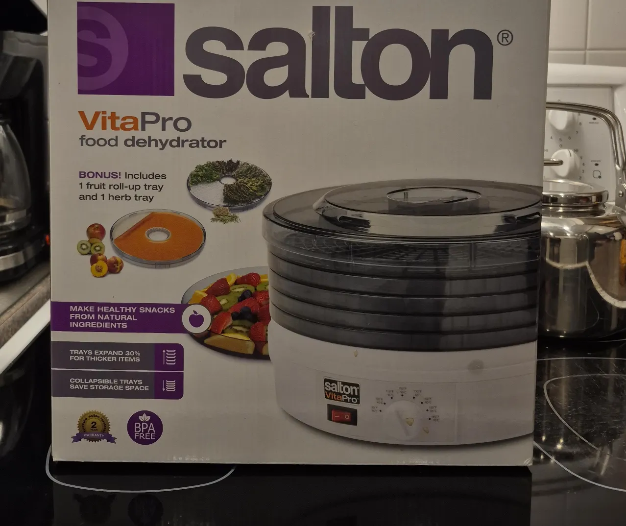 Selling a BRAND NEW NEVER USED Salton VitaPro food dehydrator in the box! It comes with 1 fruit roll-up tray and 1 herb tray. The trays are collapsible to save storage space and expand 30% for thicker items. Perfect for making healthy snacks from natural ingredients! Compare online.