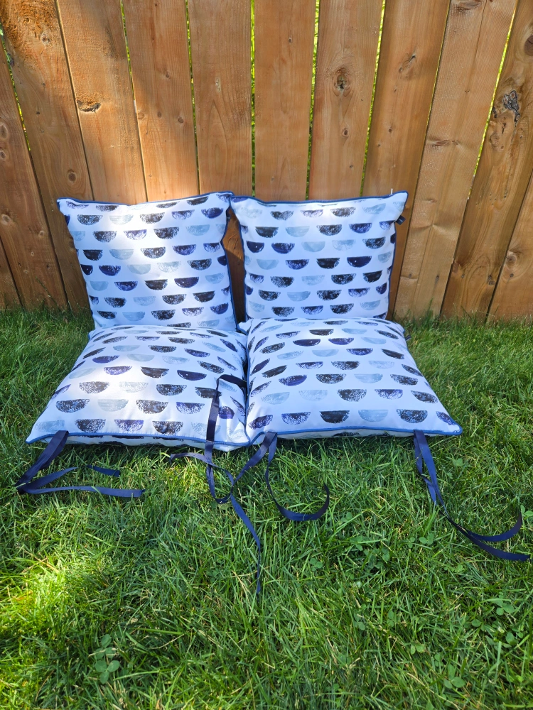 Selling a set of four outdoor cushions with a cute blue pattern. They're in great shape and ready to add some style to your patio or backyard furniture. Purchased from Simons. Great for decor or backyard support, not for sitting.