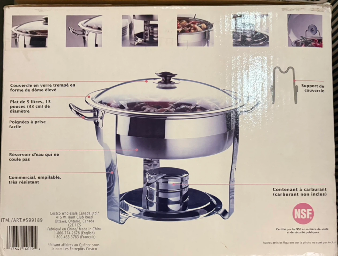 Stainless steel chafing dish with a durable glass lid. It's commercial grade and stackable, making it great for parties or events. Comes with a fuel holder, but the fuel itself isn't included. Dish capacity is 5 litres, with a 33 cm diameter.