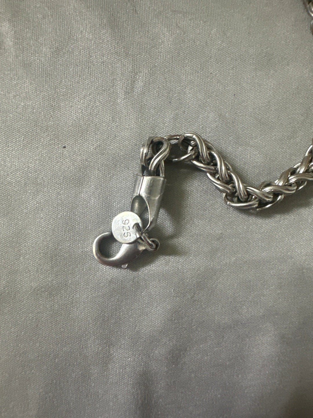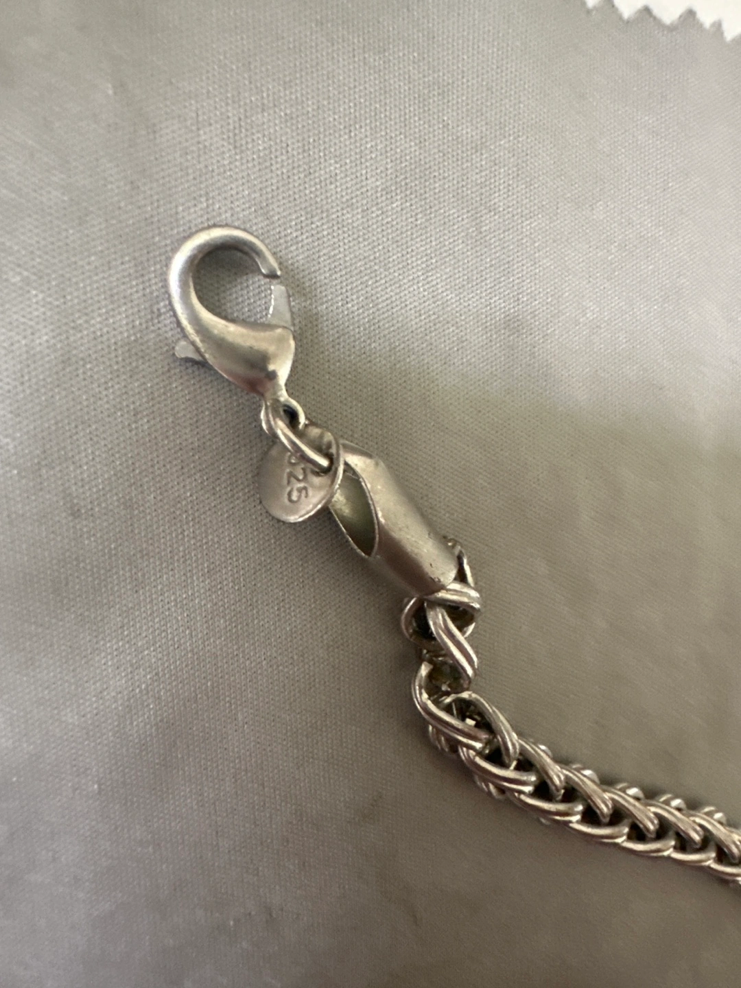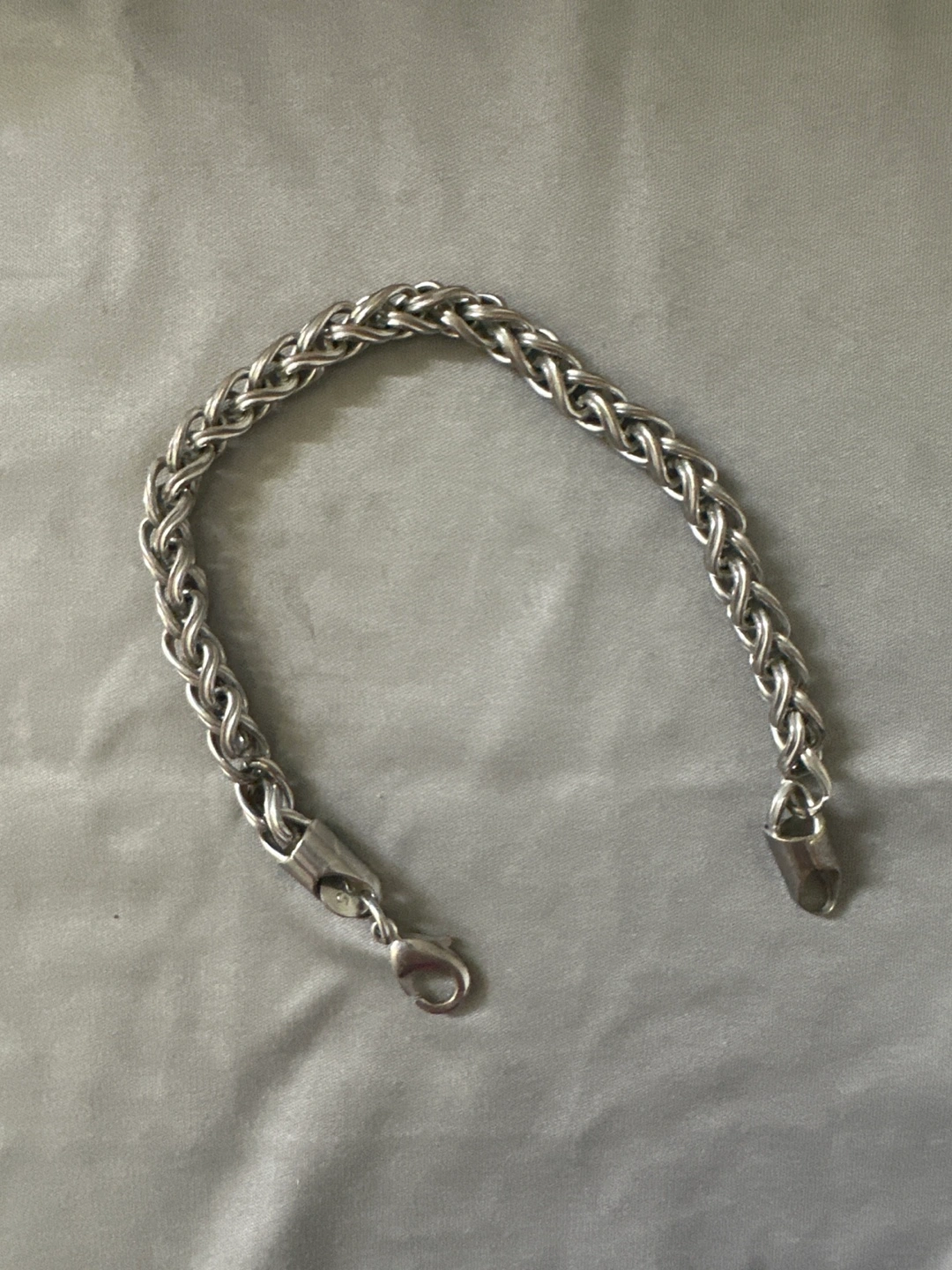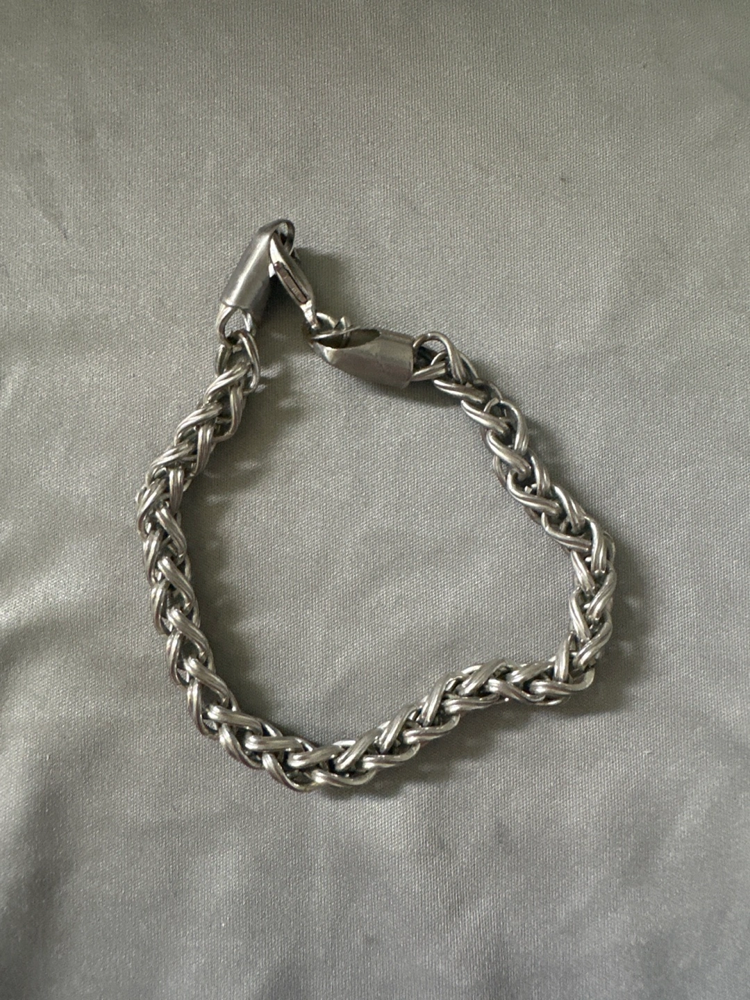 Selling a sterling silver braided bracelet. It's marked with '925', indicating it's made of sterling silver. The bracelet has a braided design and a lobster clasp closure. It's in great condition and ready for a new owner