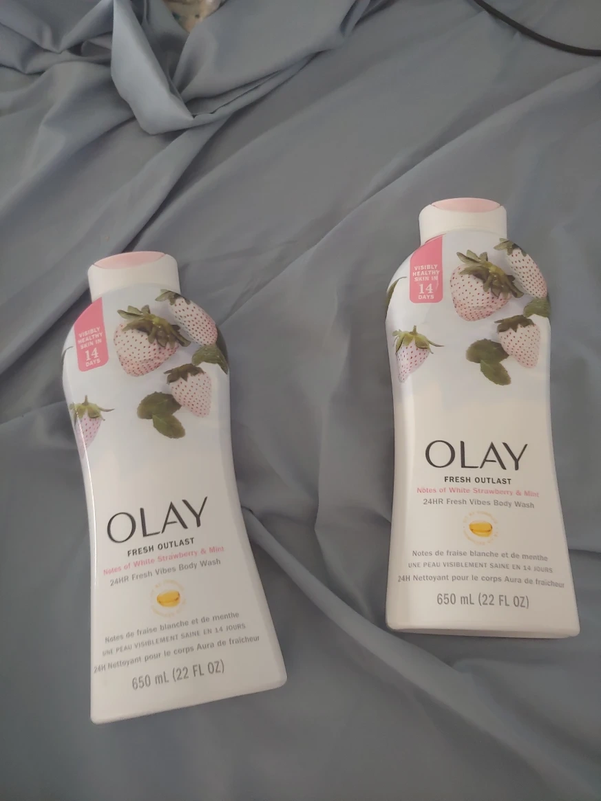 Selling two bottles of Olay Fresh Outlast body wash in the White Strawberry & Mint scent! Each bottle contains 650 mL (22 FL OZ) of product. Enjoy a refreshing and fragrant shower experience with this body wash!