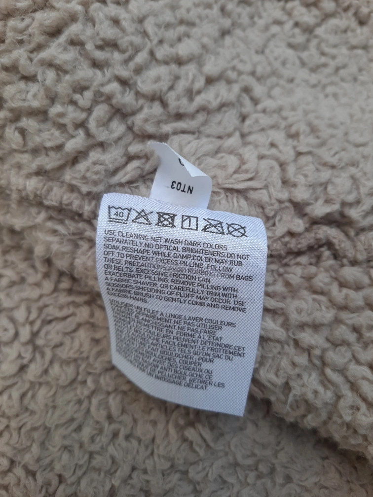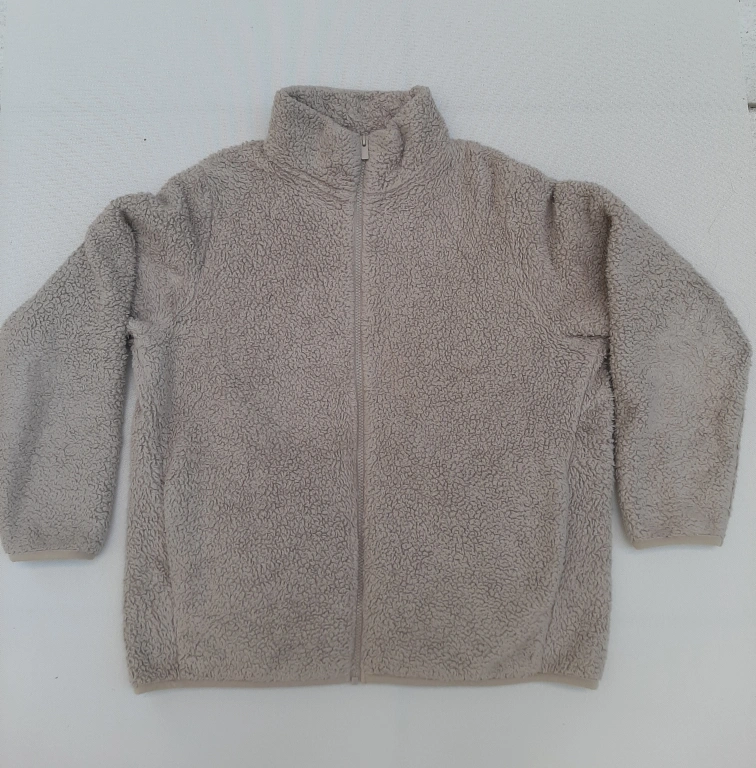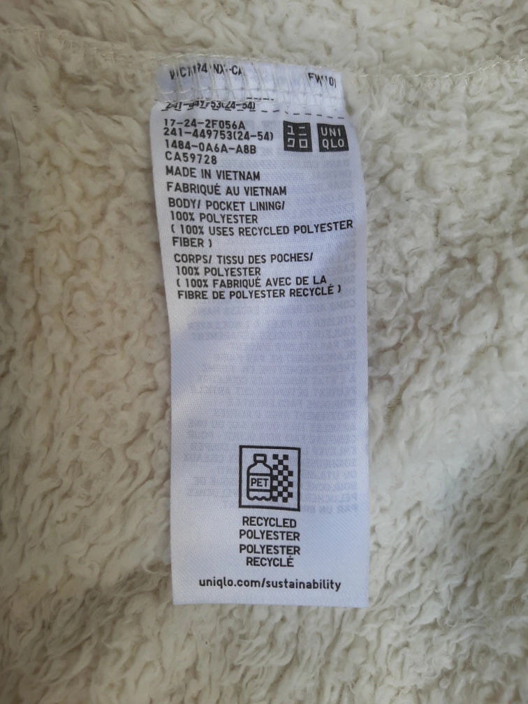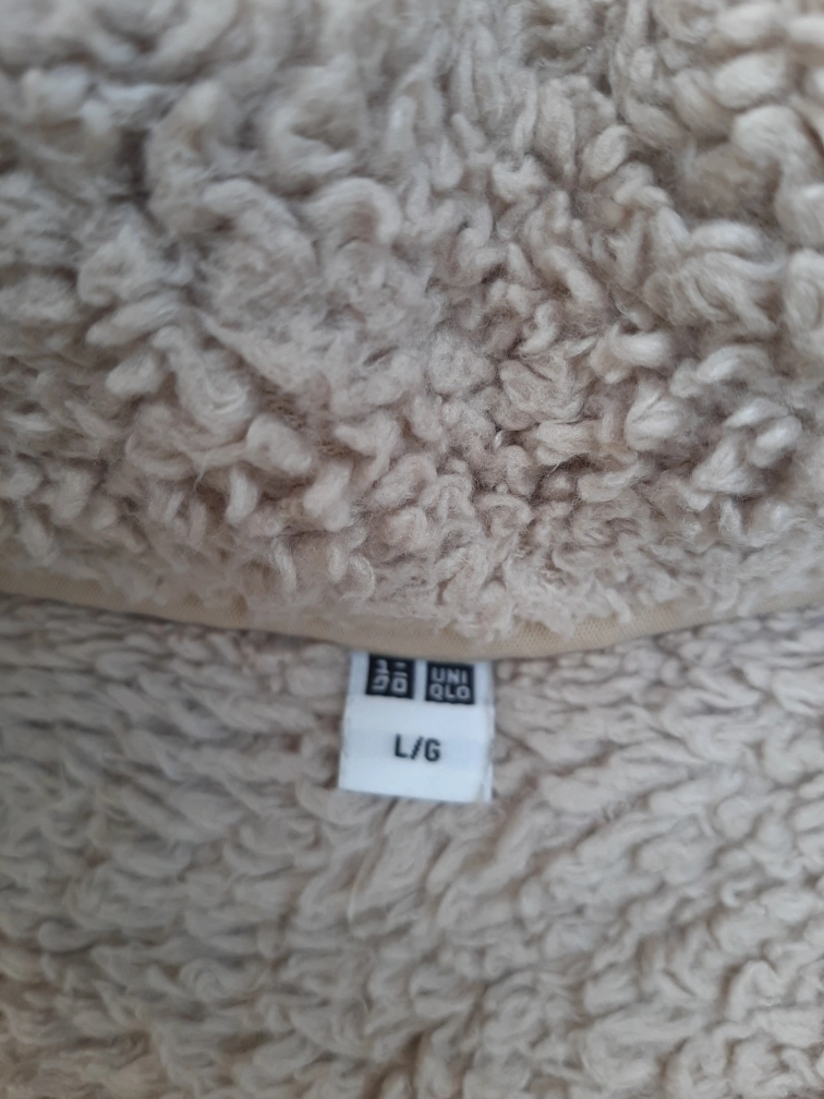 Cozy up in this Uniqlo fluffy yarn fleece jacket! It's a lovely beige colour and a size L/G. The body and pocket lining are made of 100% polyester, including recycled polyester fibre. Perfect for layering on chilly days!