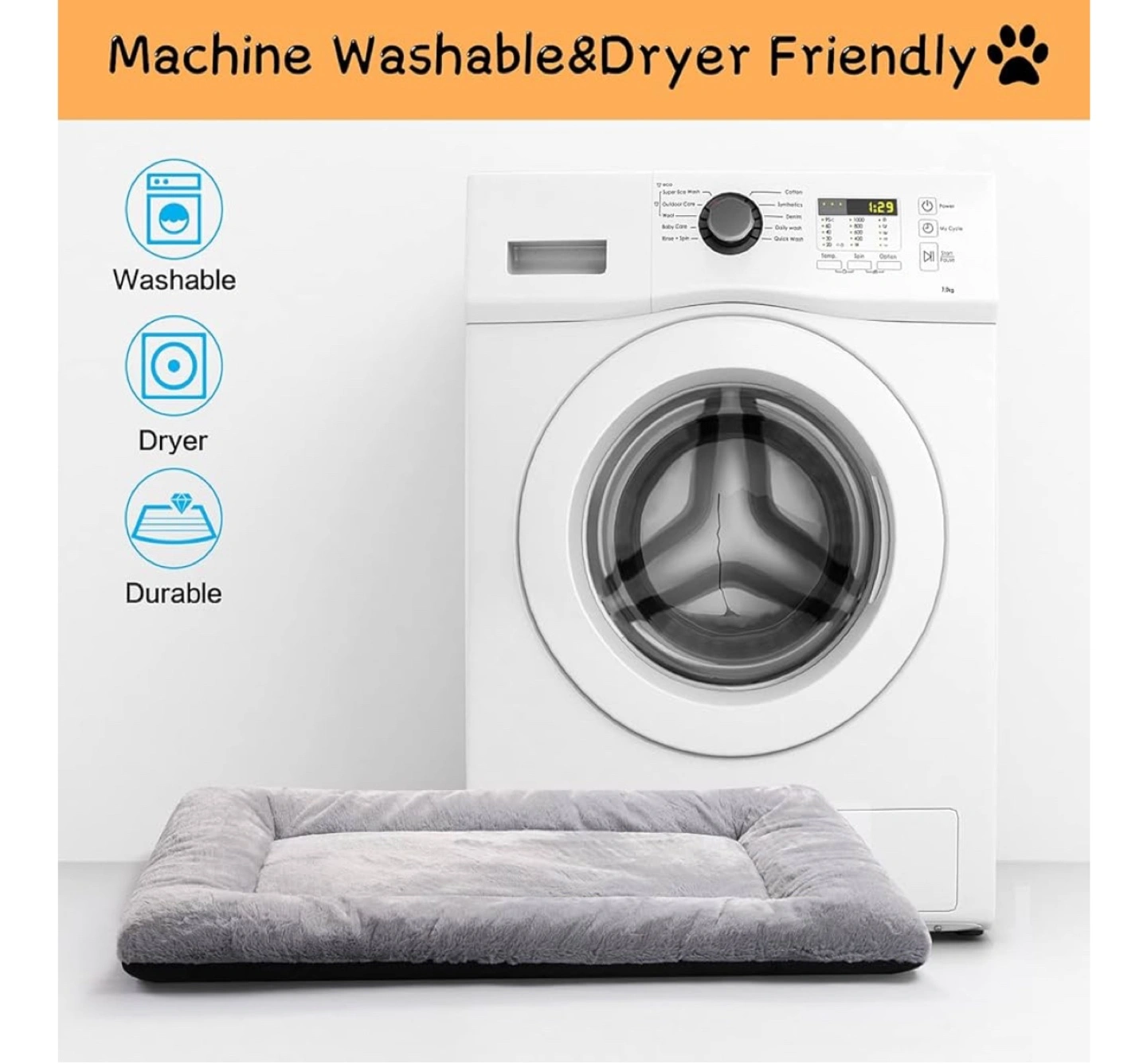 This cozy pet bed is perfect for your furry friend! It's gray, soft, and made of safe material. The size is 61cm x 46cm x 2.54cm, or about 24 inches, making it ideal for small dogs or cats. It's also machine washable and dryer friendly, so it's easy to keep clean!