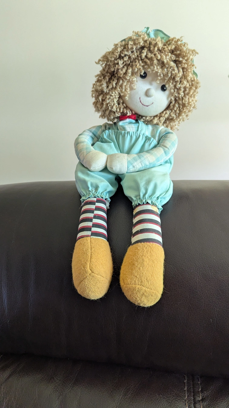 A cute vintage musical (wind up) rag doll is up for grabs! She has adorable curly hair and a sweet little outfit. Perfect for collectors or as a charming addition to a child's room