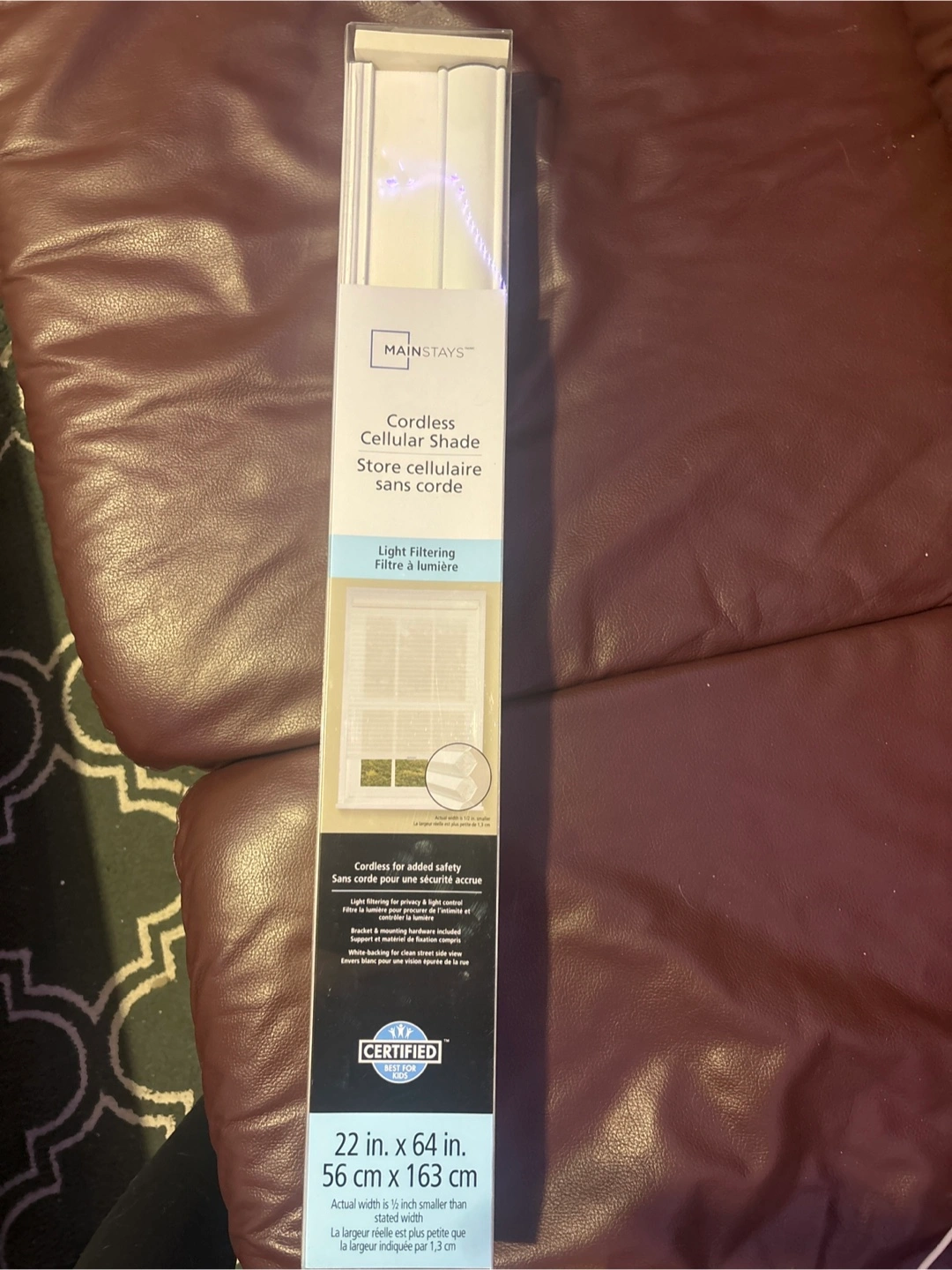 68Selling a Mainstays cordless cellular shade. It's light filtering and adds a touch of elegance to any room. The shade measures 22 inches x 64 inches (56 cm x 163 cm). It's brand new in the box, never opened!