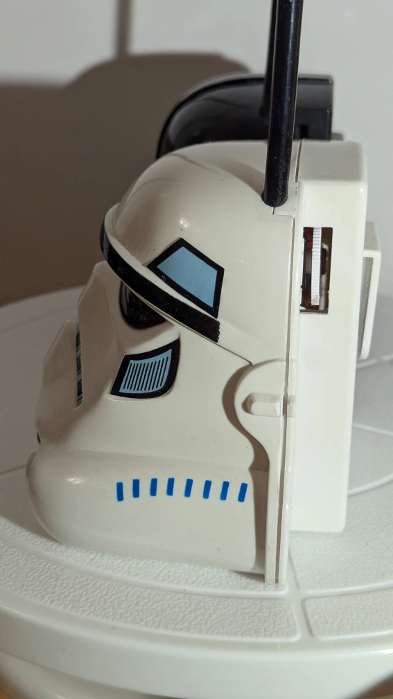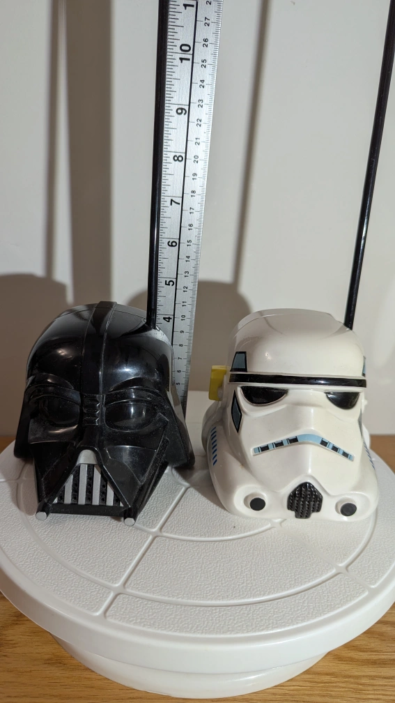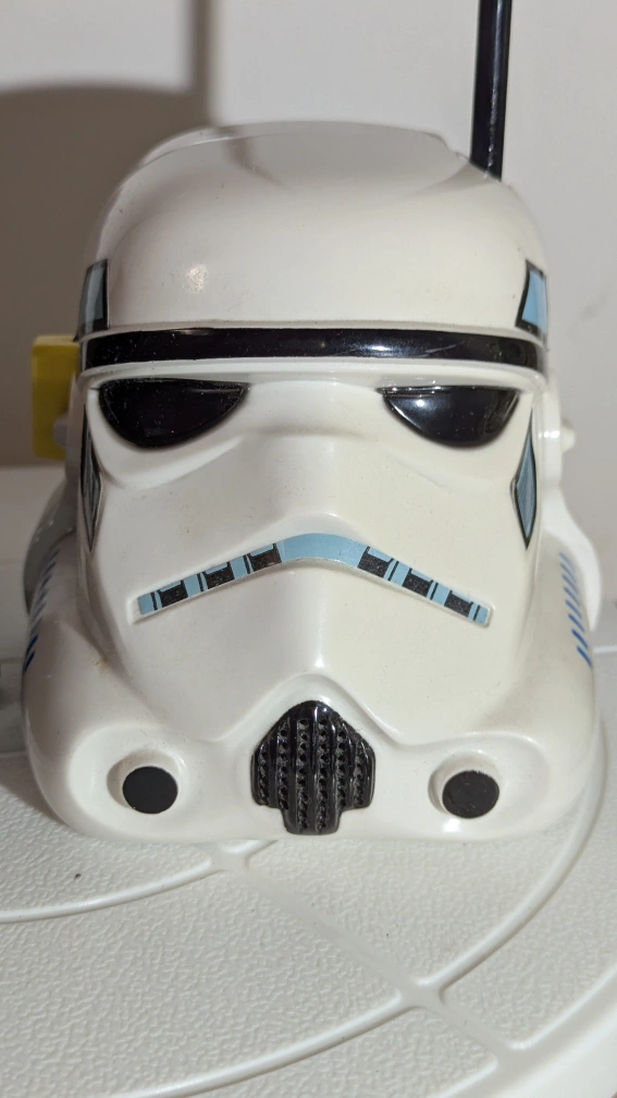 Selling a pair of Star Wars walkie talkies shaped like Darth Vader and a Stormtrooper! They're in good condition and ready for a new adventure. Darth Vader is missing his battery cover. These are made by MicroMachines. I displayed them only. Not tested.