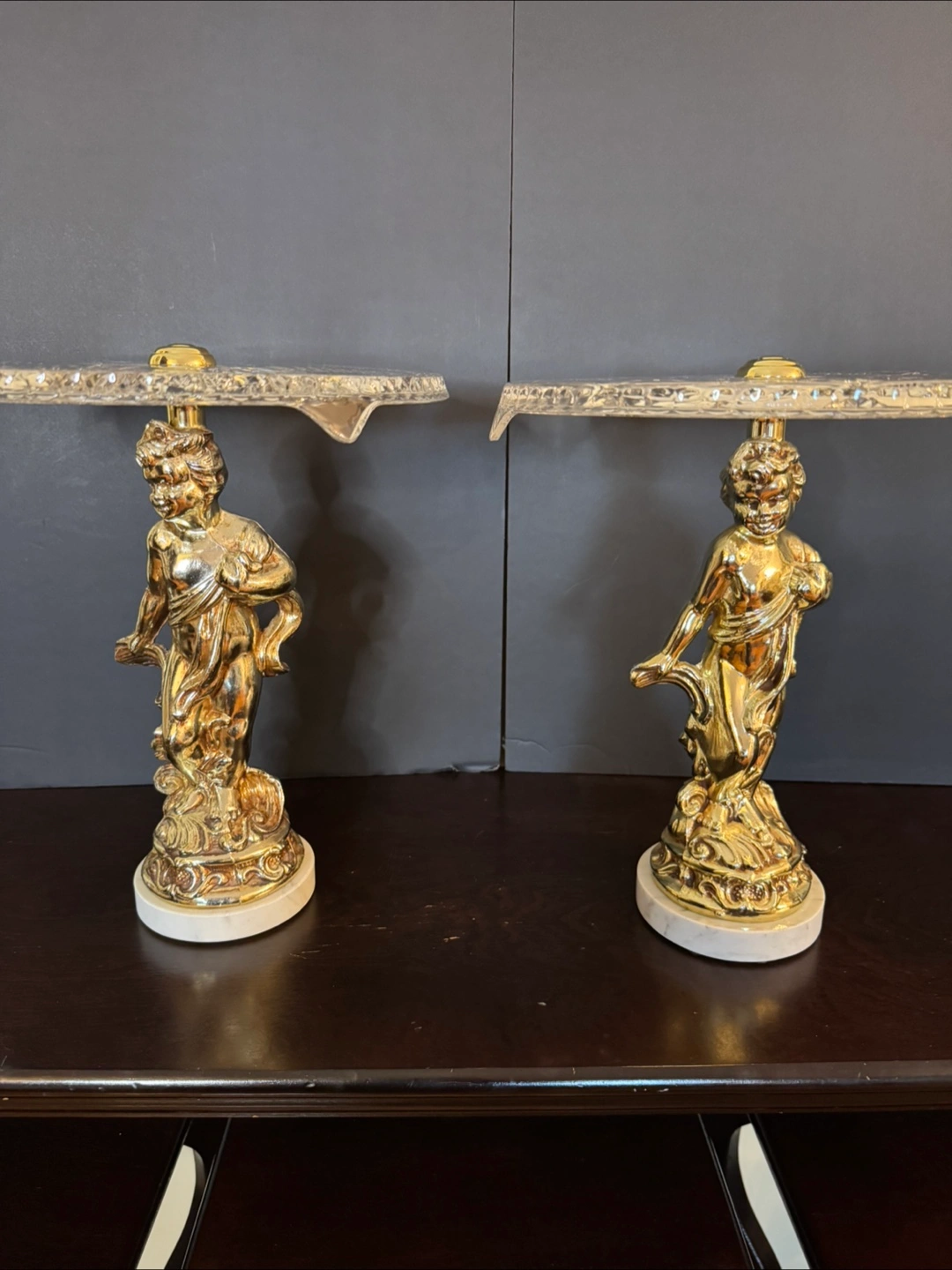 Selling a pair of vintage cherub cake stands! These feature a golden cherub and marble base and a crystal top with intricate detailing. They'd make a lovely addition to any table setting or collection.High 13 inch,diameter 12 inch