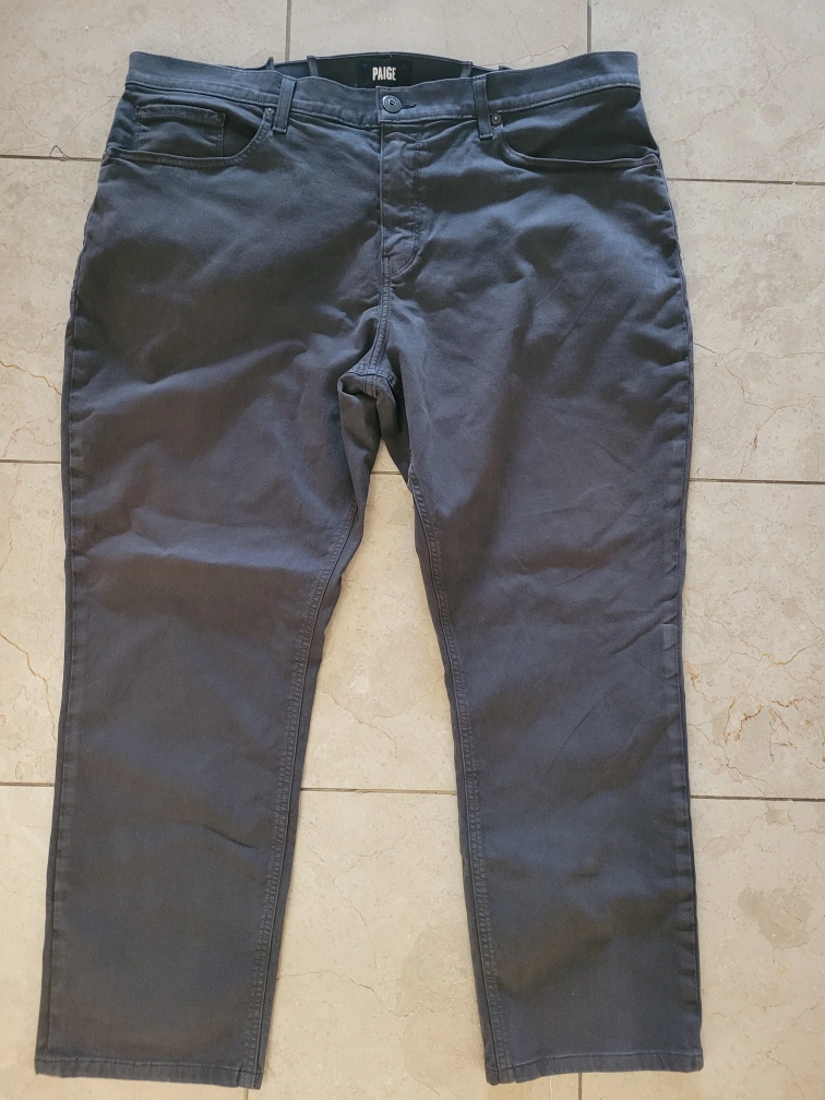 Selling a pair of Paige men's pants in size 40. They're a stylish grey colour and made from a comfortable blend of 70% cotton, 27% recycled cotton, and 3% elastane