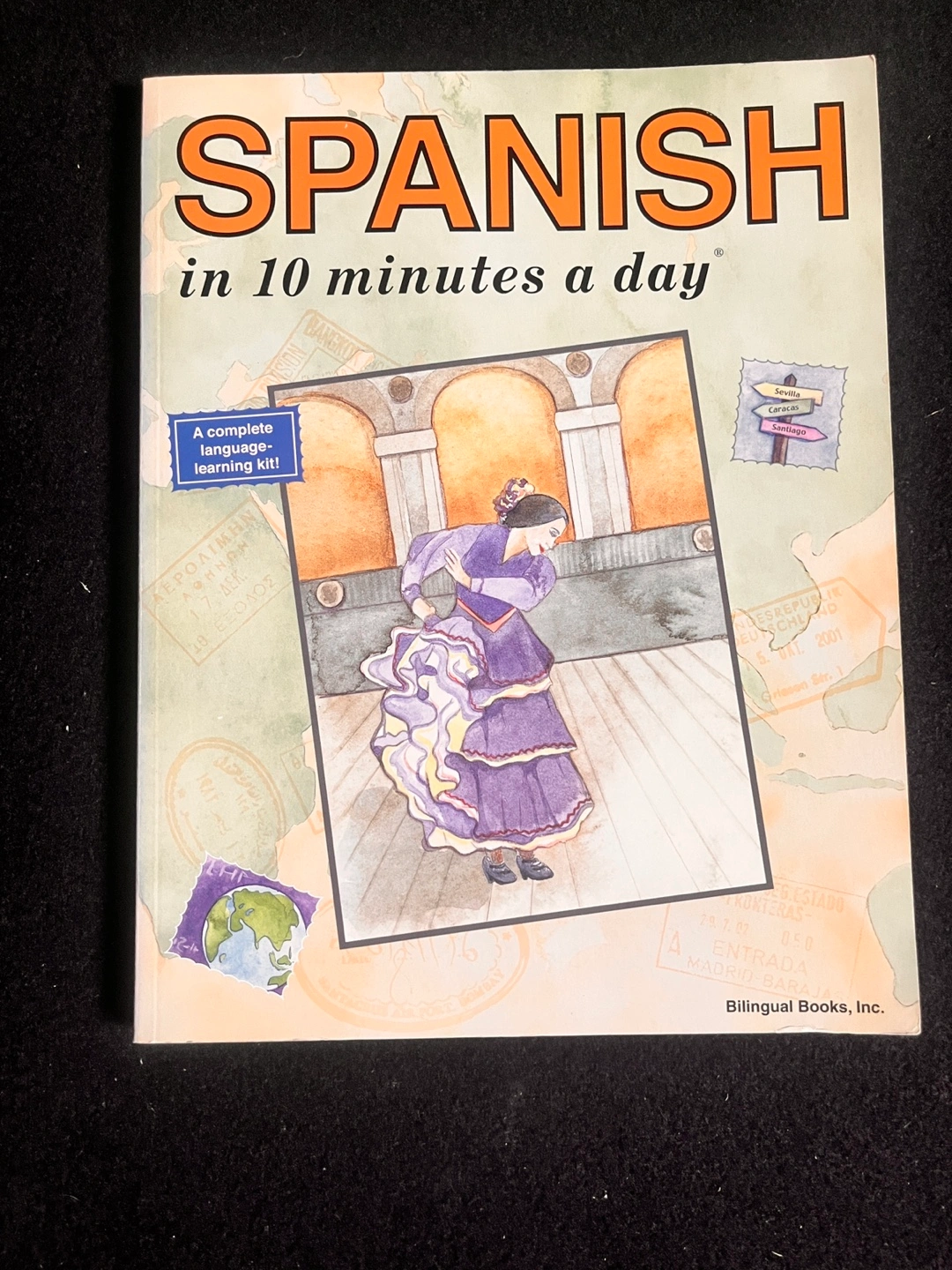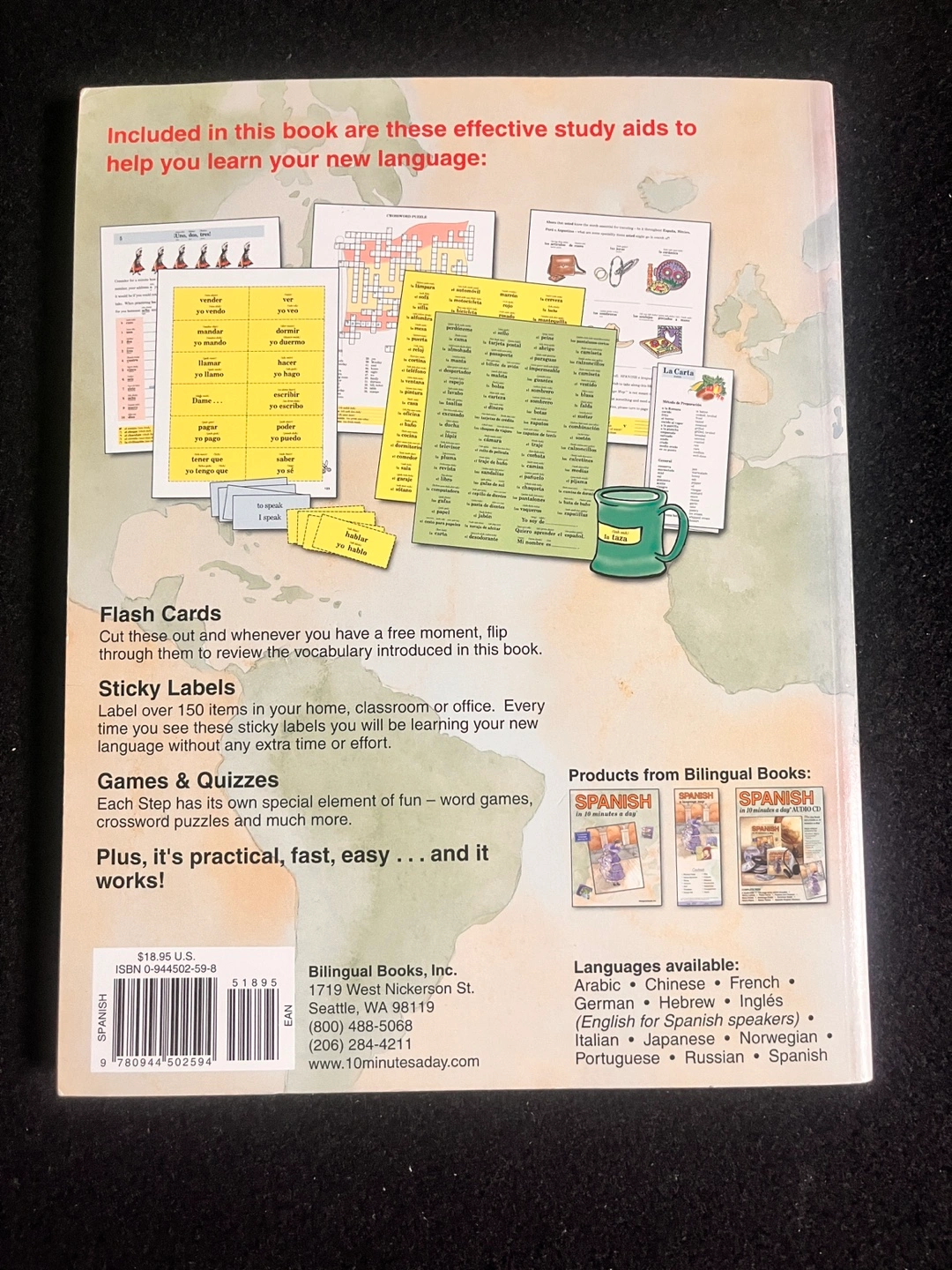 Learn Spanish quickly with this complete language learning kit, "Spanish in 10 Minutes a Day" by Bilingual Books, Inc! It includes flashcards and sticky labels to help you learn new vocabulary. A fun and easy way to pick up a new language!