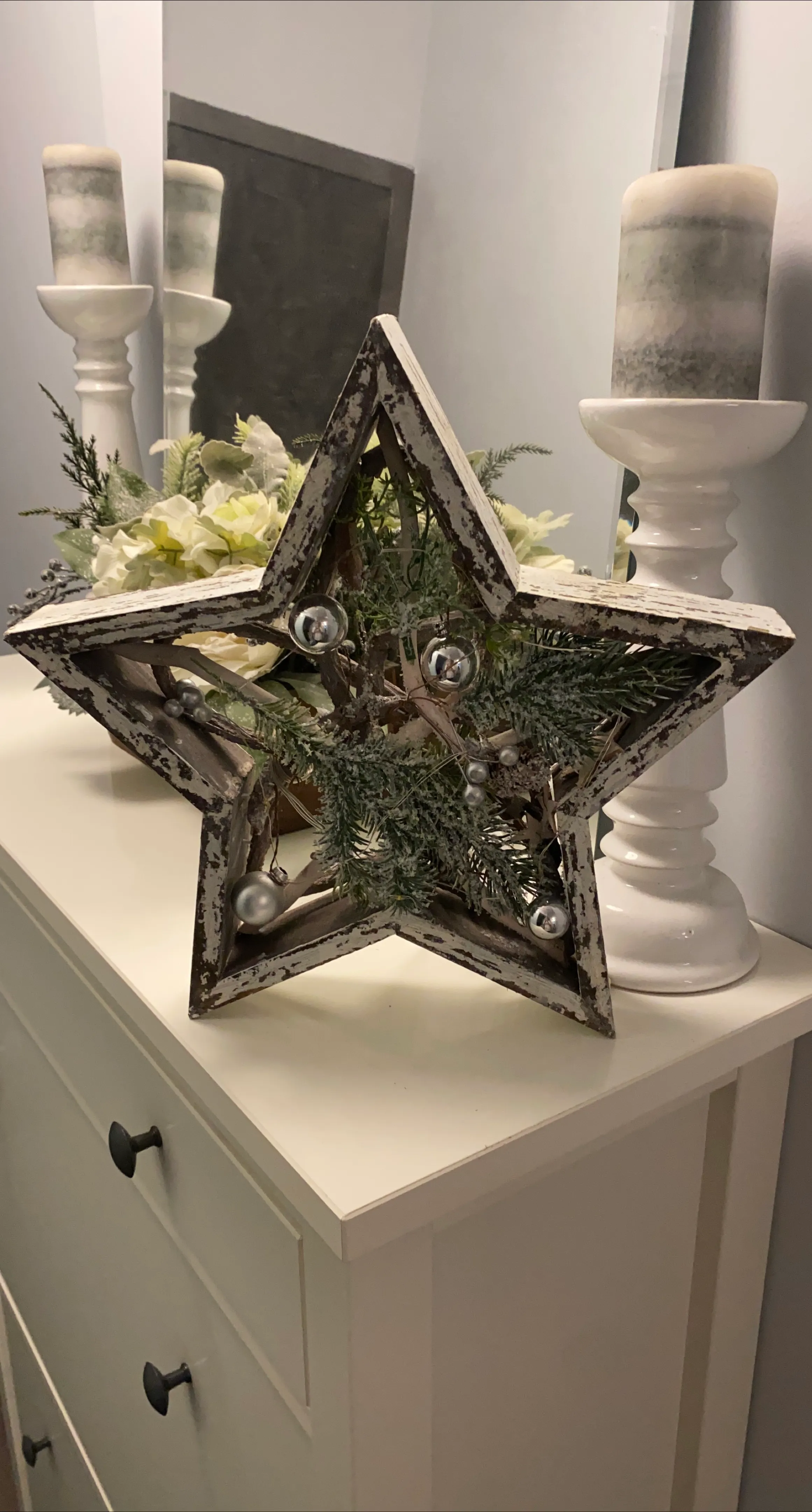 This charming rustic wooden star is perfect for adding a touch of cozy warmth to any room! It features delicate ornaments and greenery inside, making it a lovely decorative piece for your home
