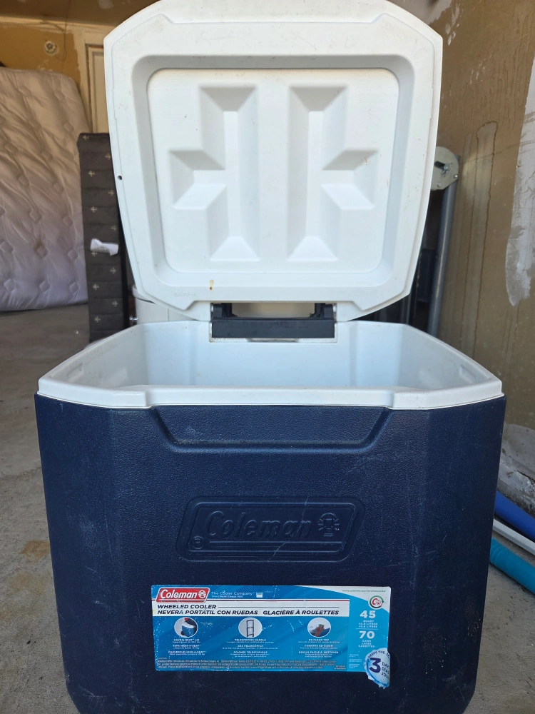Coleman wheeled cooler with a 45-quart capacity. It can hold 70 cans. It also features a have-a-seat lid that supports up to 113 kg, a telescoping handle for comfortable pulling, and an EZ-clean top for quick washing