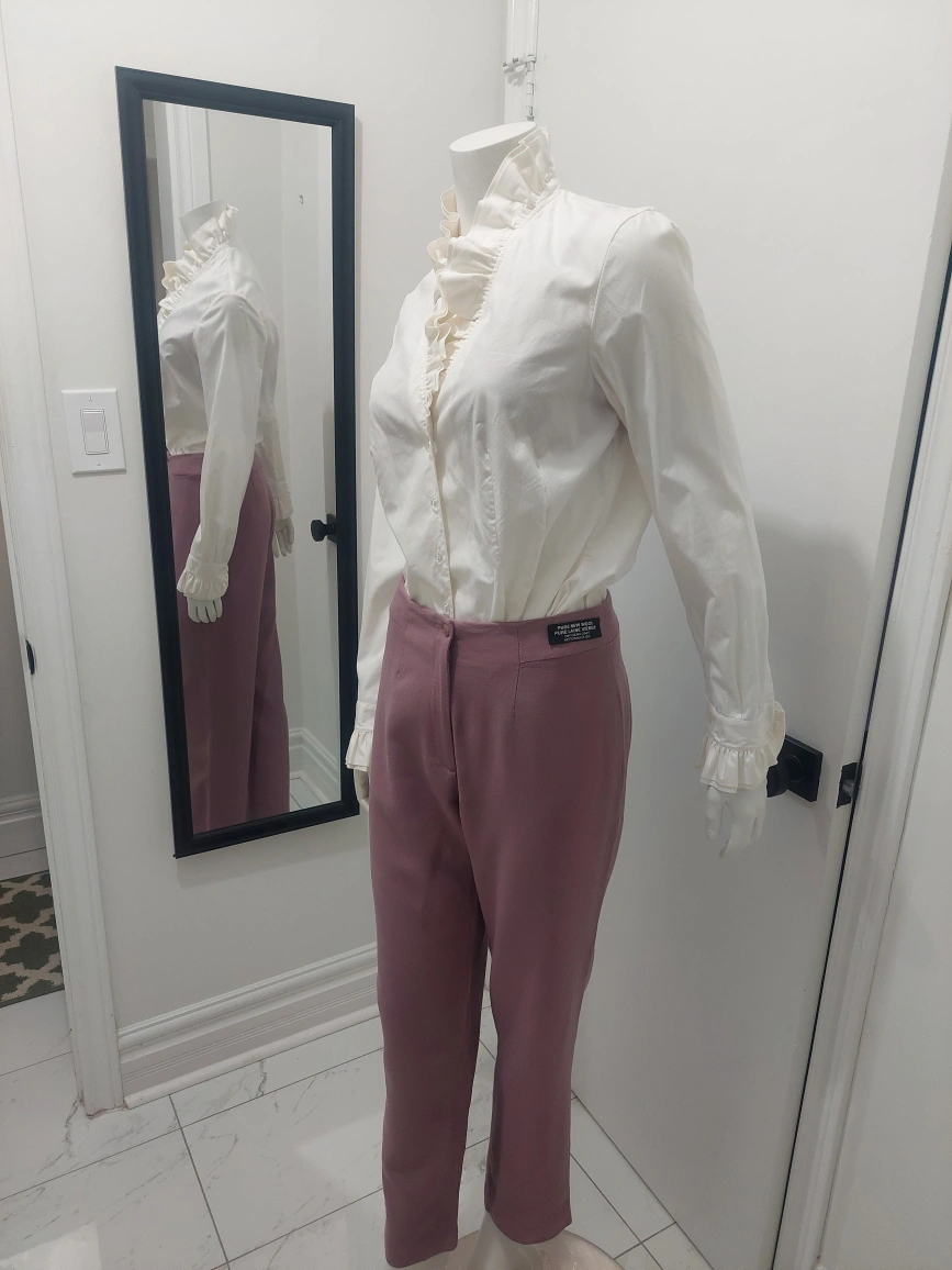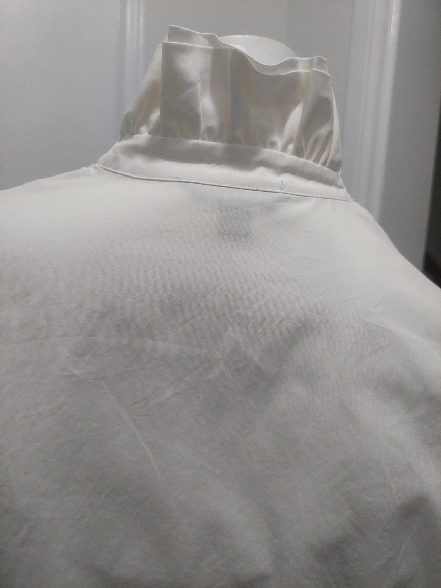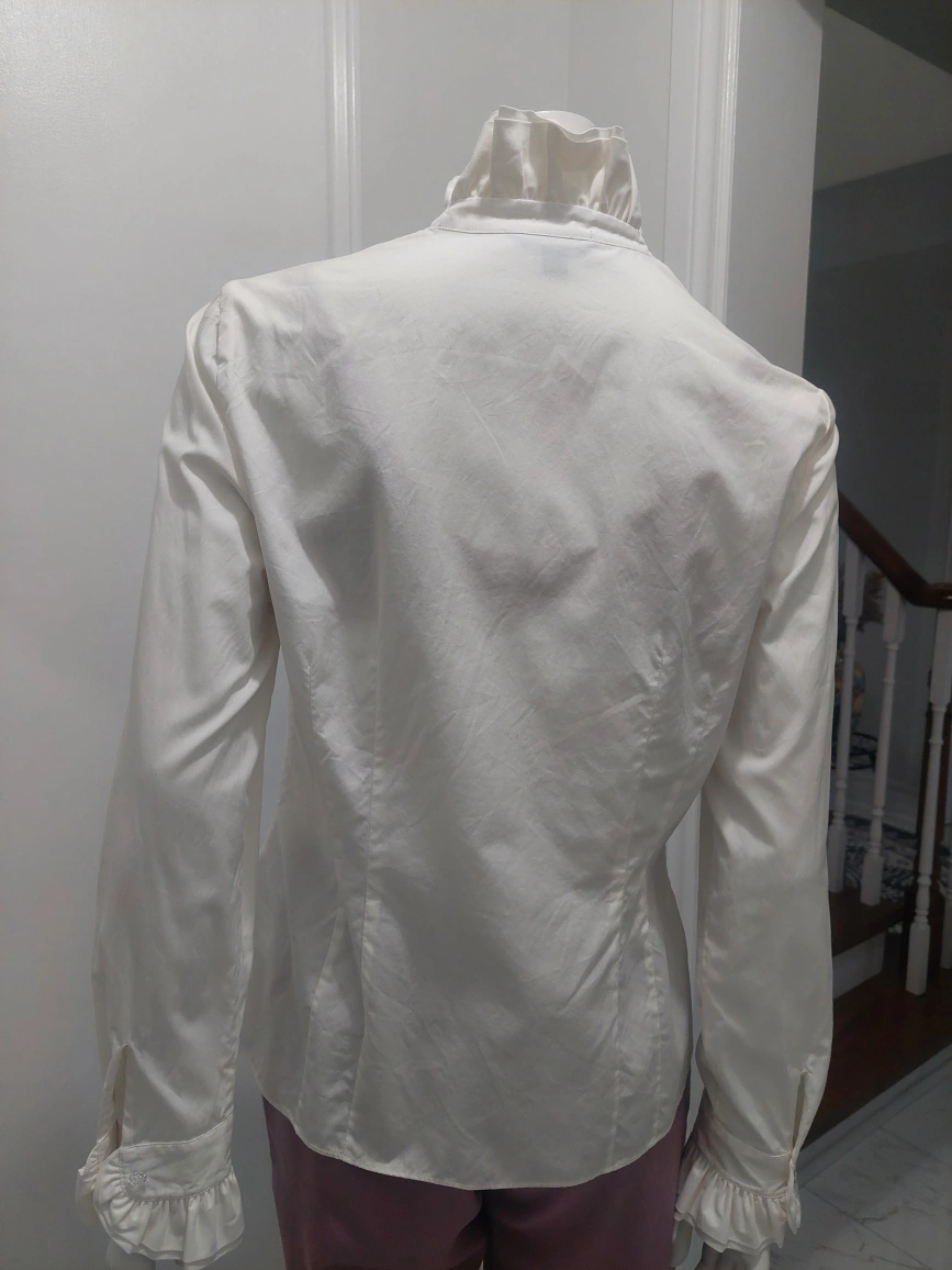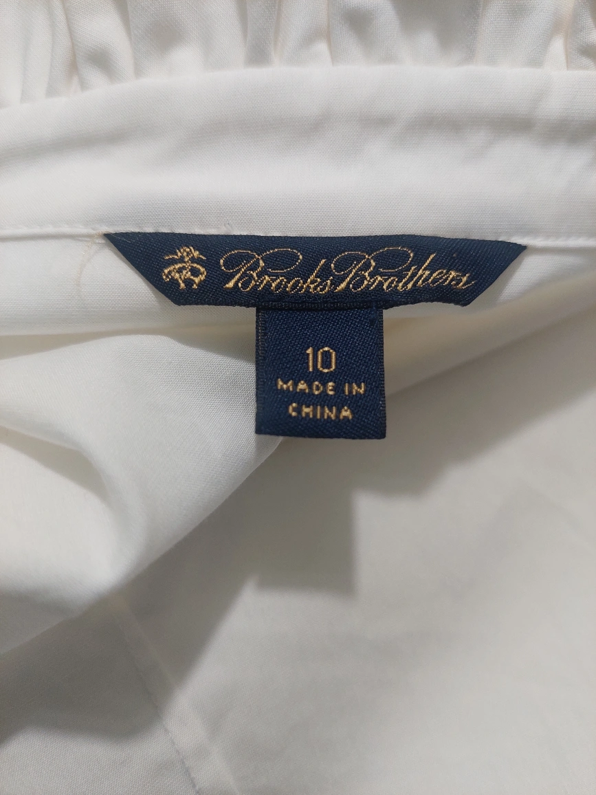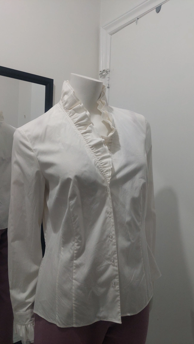 Brooks Brothers white blouse with a ruffle detail on cuffs and collar. It's a size 10 and in great condition. Perfect for adding a touch of elegance to your wardrobe. Pants is also on sale!
