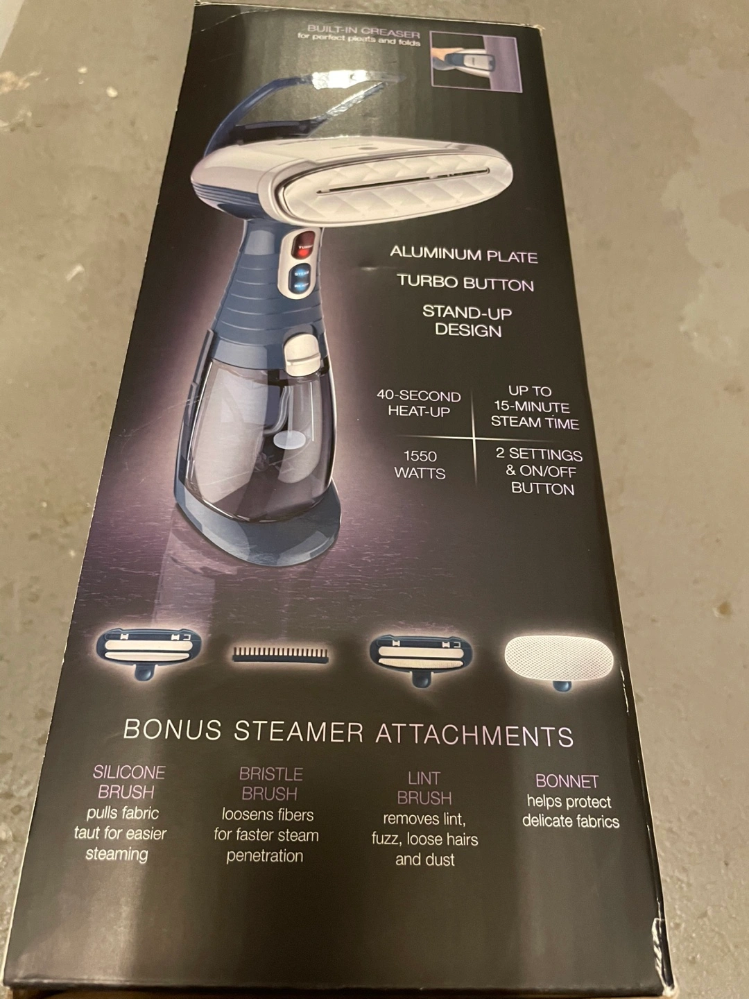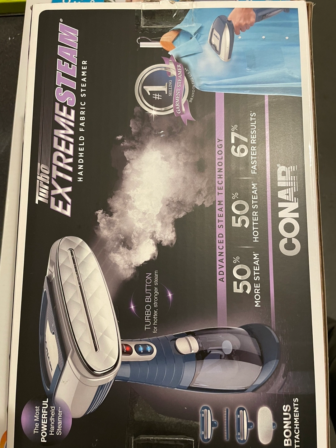 I'm selling a Conair Turbo ExtremeSteam handheld fabric steamer! It features advanced steam technology, delivering 50% more steam and 50% hotter steam for 67% faster results. The steamer heats up in just 40 seconds and provides up to 15 minutes of continuous steam. It also comes with bonus steamer attachments, including a silicone brush, bristle brush, lint brush, and bonnet. The box is included!