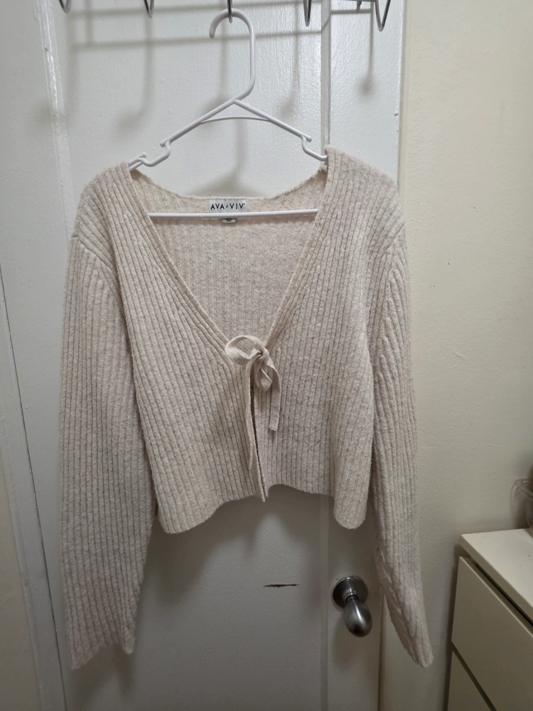 Selling an AVA & VIV cardigan in size 1X! It's a cream color and features a tie at the front. Perfect for layering