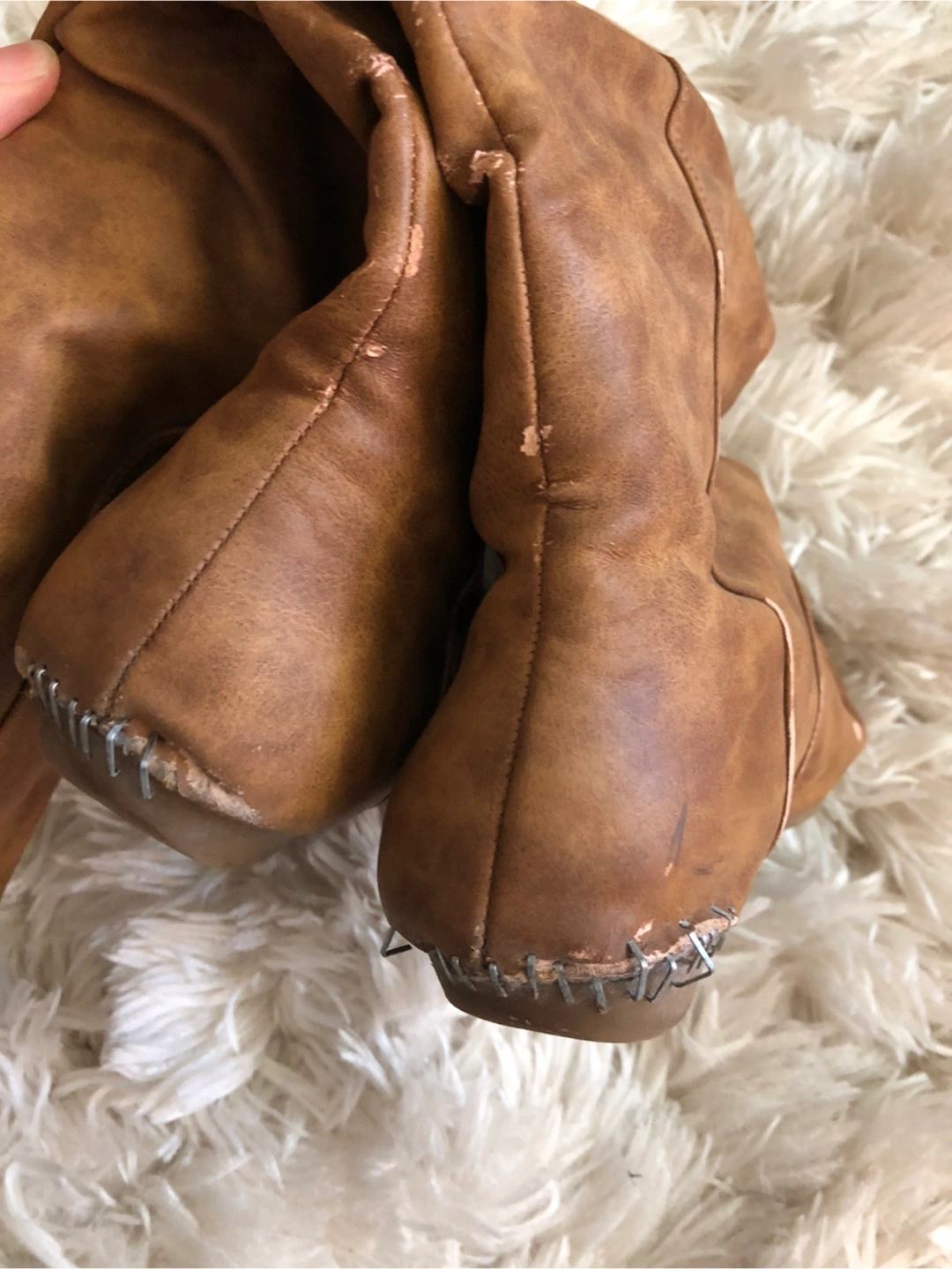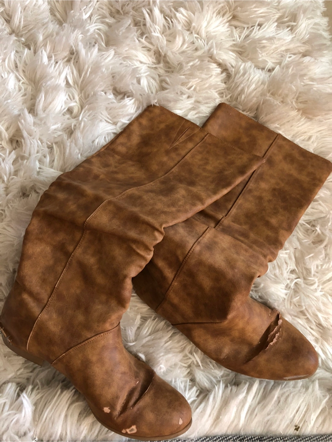 Gorgeous pair of brown knee-high boots. Very well worn. Will need some repair to the heel as seen in the photos. But I loved them so much π. If you know how to fix feel free to have them.