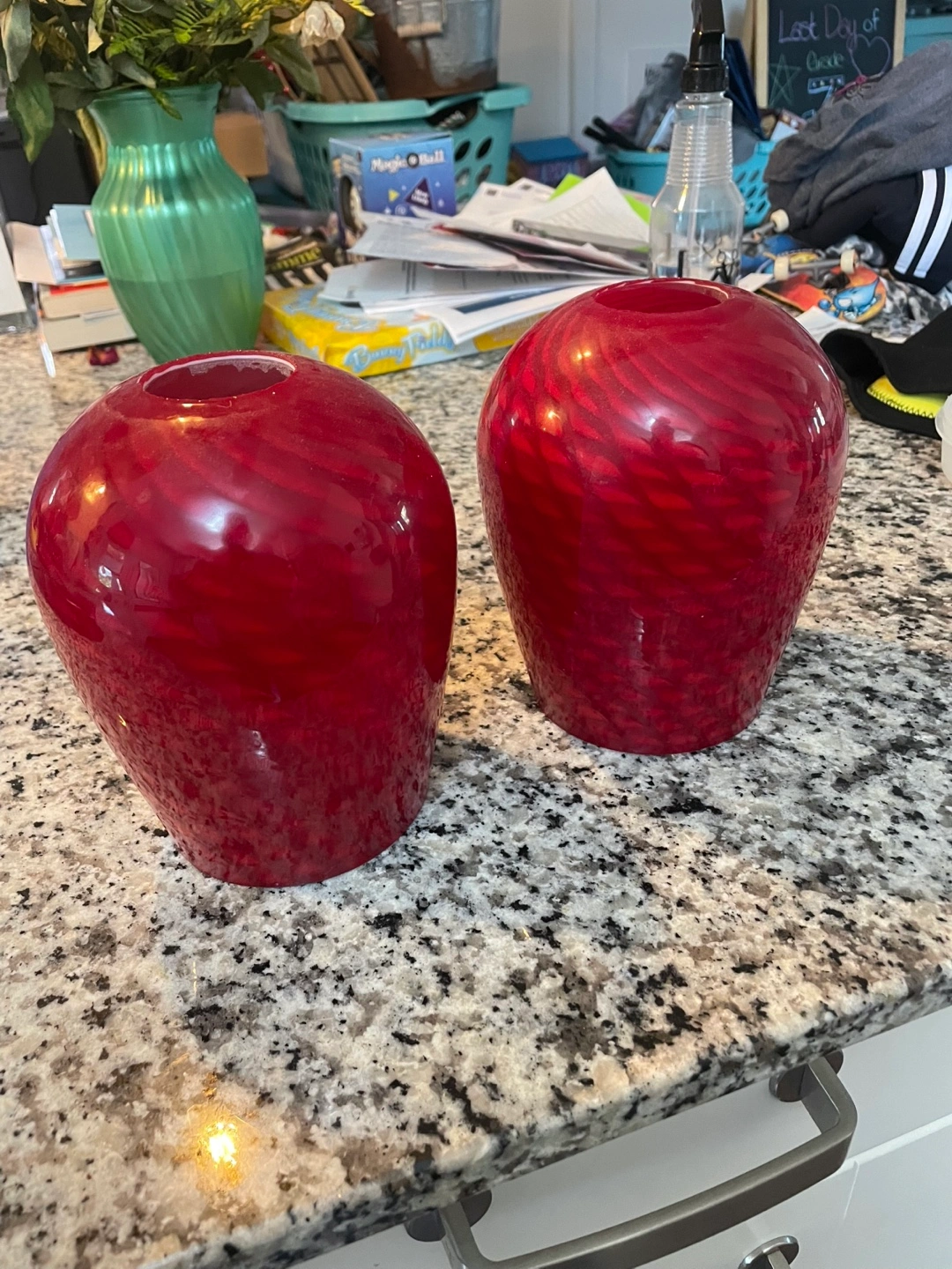 Red glass lamp shades. For hanging pendant style lights . Example in last picture . $20 for the pair . Pick up Main and Ottawa area Hamilton casinos E transfer