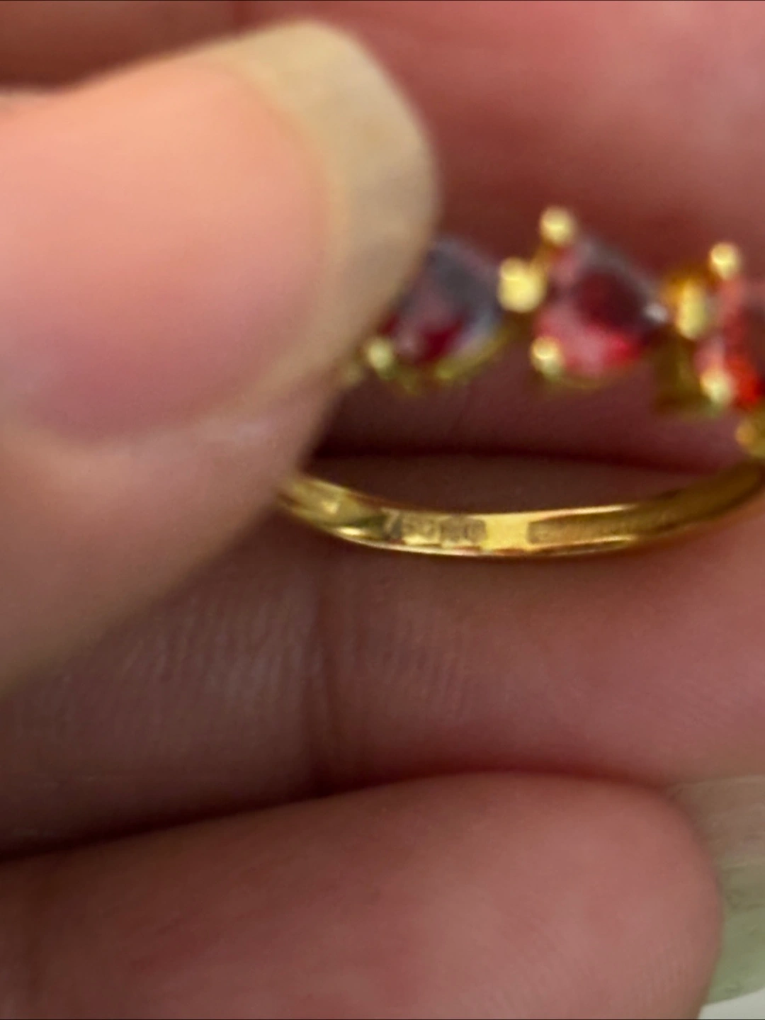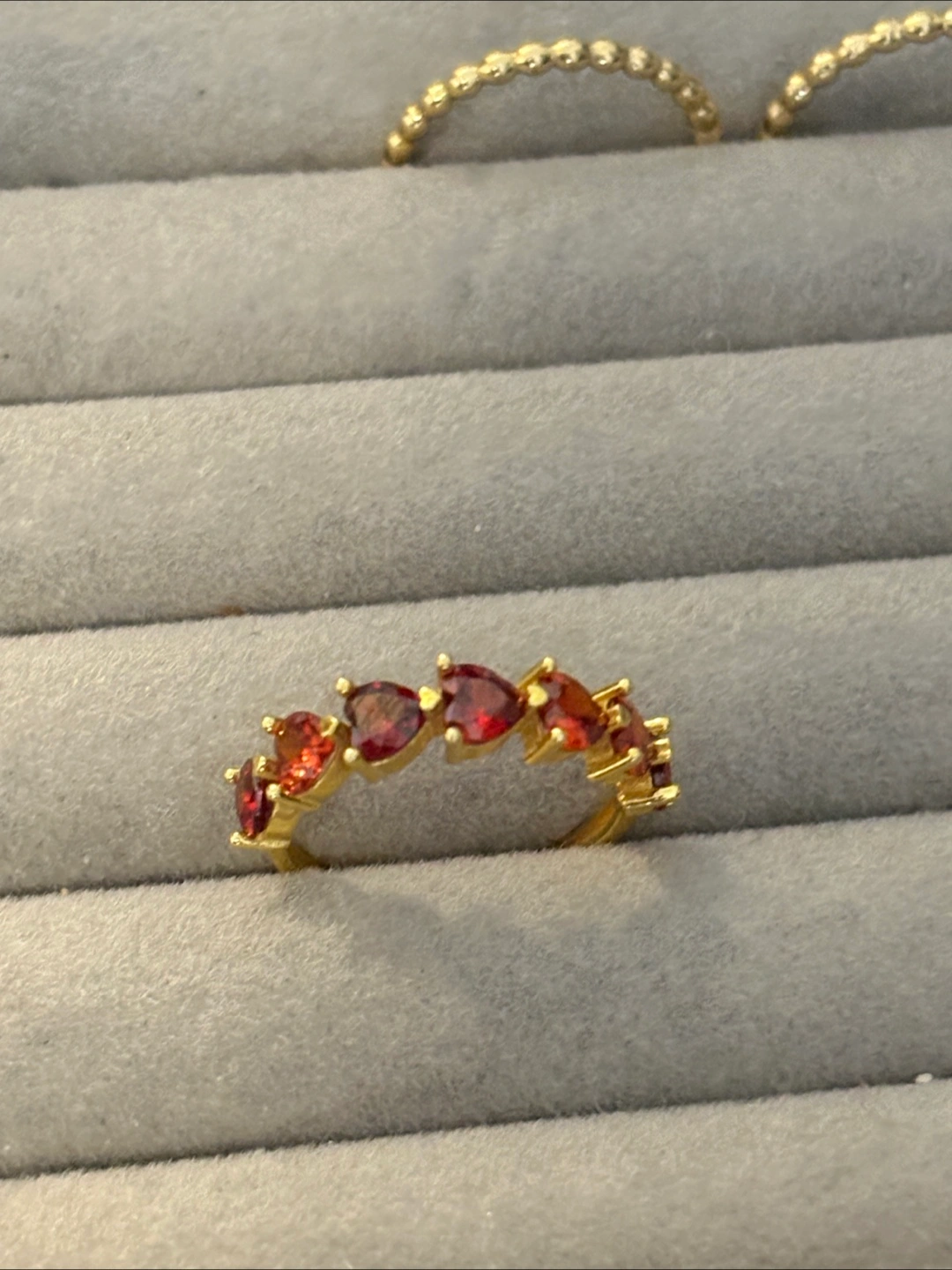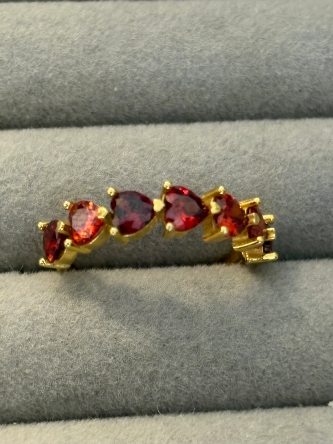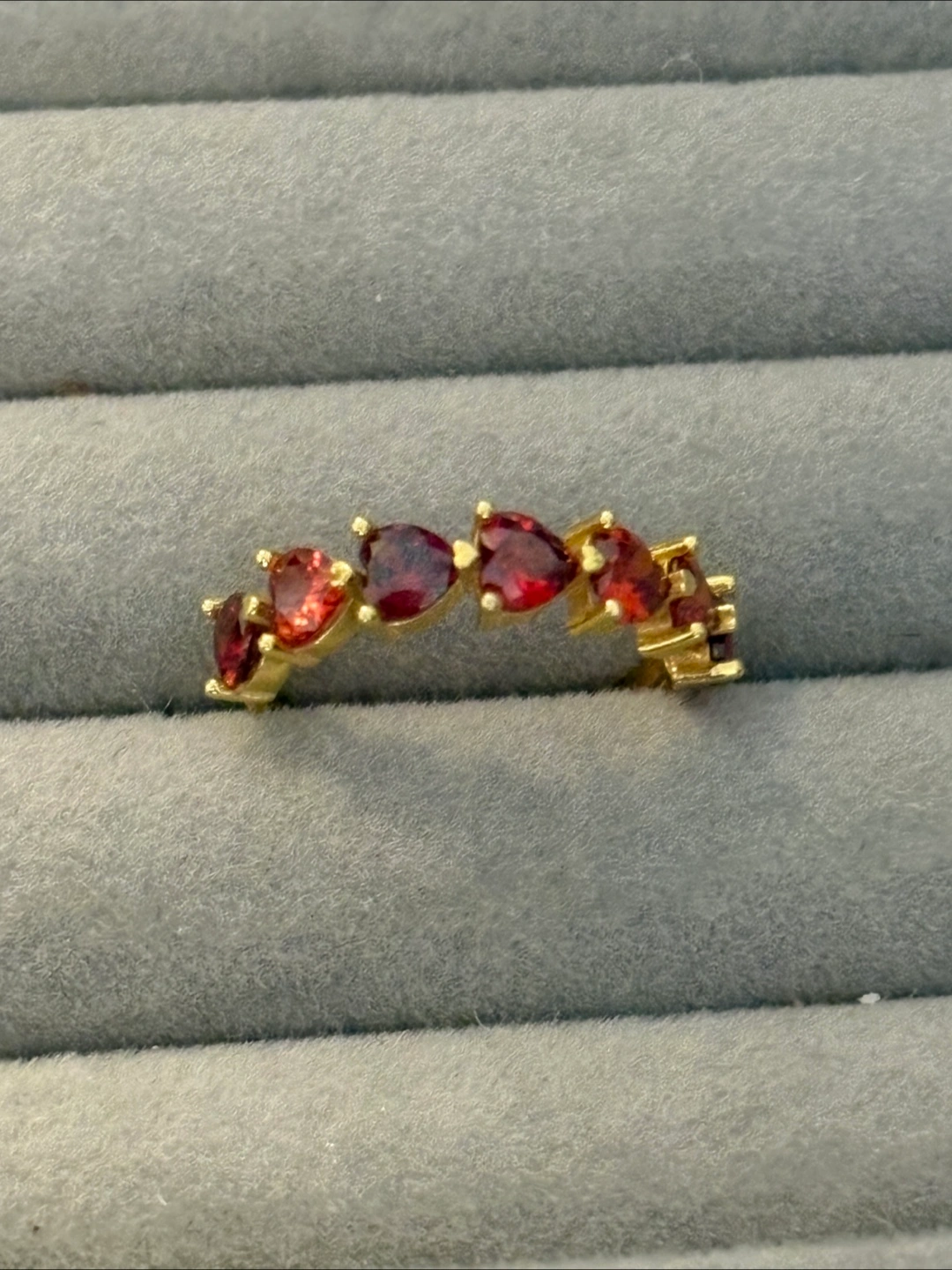 This is a lovely gold ring featuring red gemstones. It would make a beautiful addition to any jewellery collection!