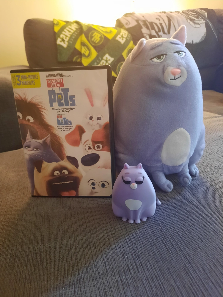 The image shows a DVD and two plush toys of the character Chloe the cat from the movie The Secret Life of Pets.