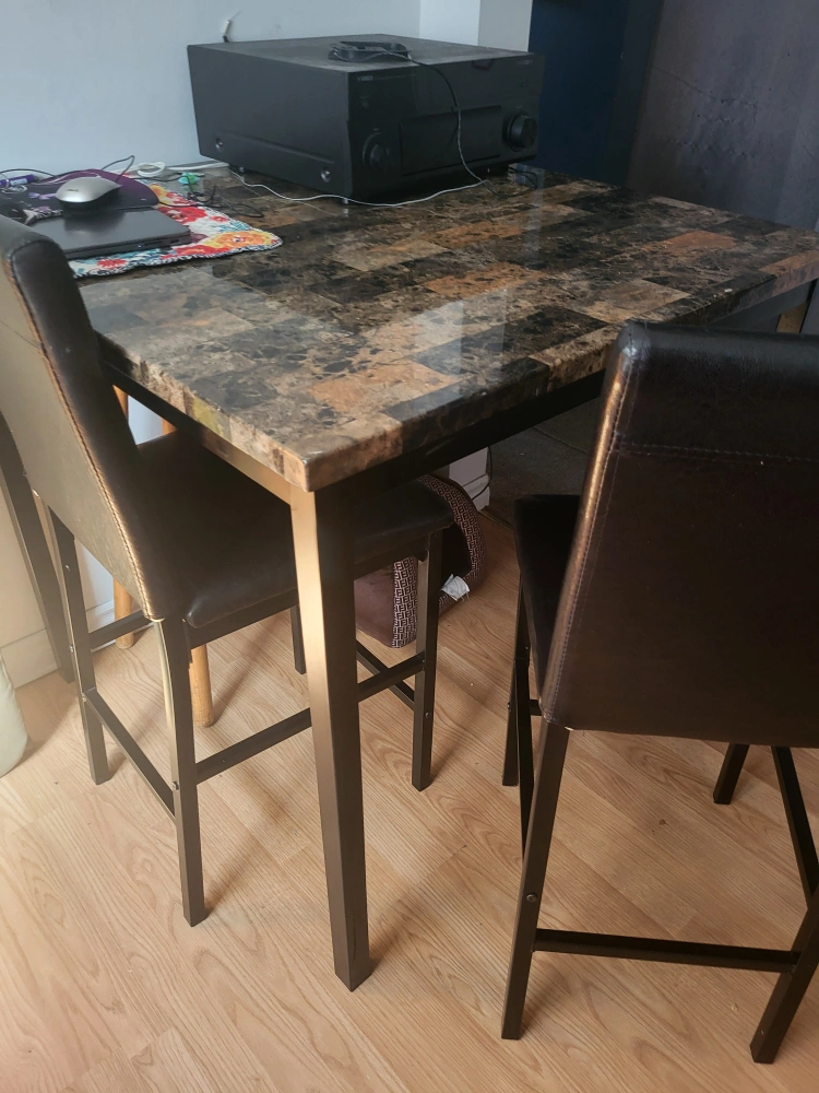 Selling a 3' high square dining table set that includes two bar stools. The table has a unique, patterned top, and the stools are upholstered in a dark colour. Great for a kitchen or small dining area! Evenings or weekends for pick up only.