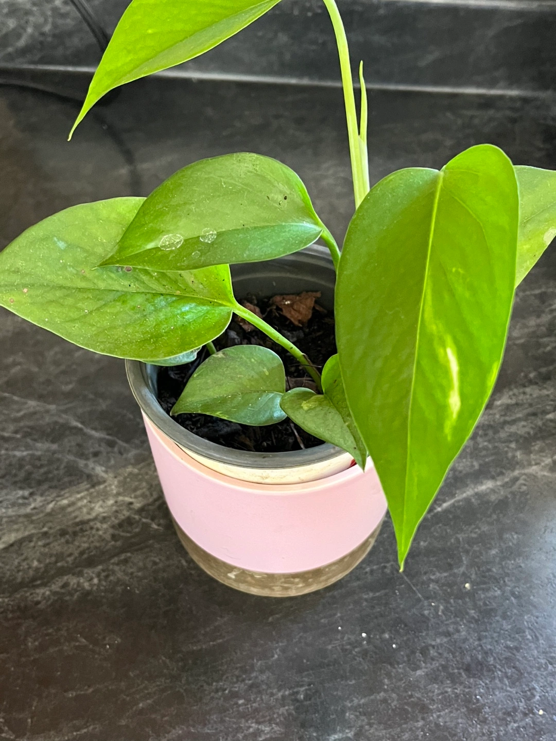 Pothos plant in a cute pink and gold pot! The plant is healthy and would look great in any home. The pot has a modern design that will complement any decor