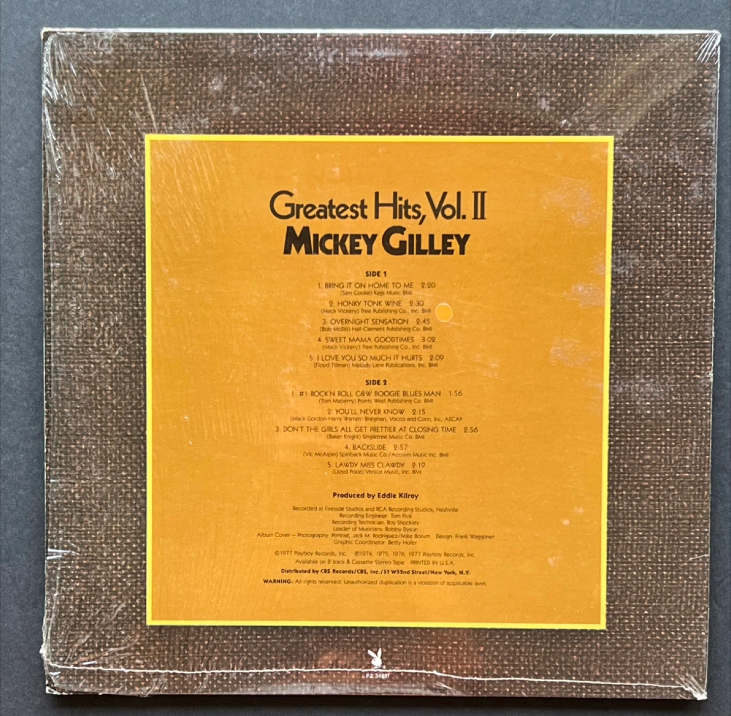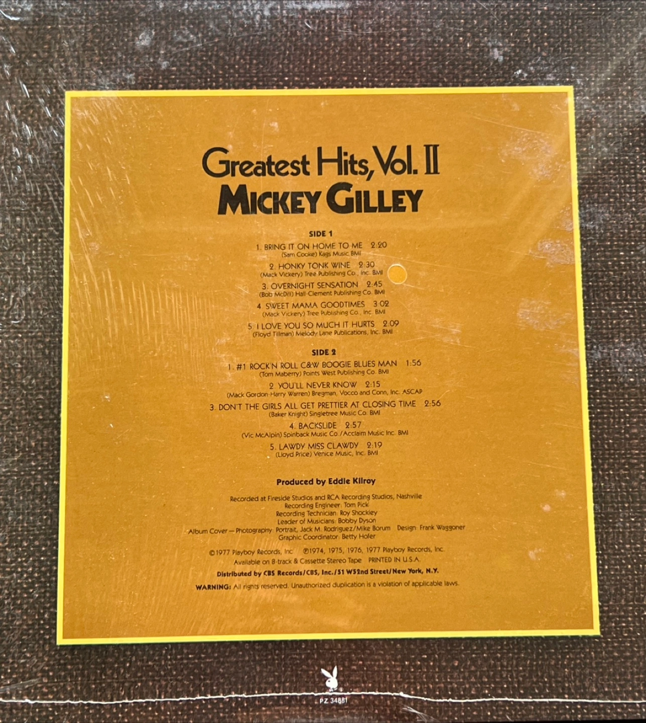 205Selling a sealed copy of Mickey Gilley's Greatest Hits, Vol. II on vinyl! It's still in its original packaging, so it's in great condition. Side 1 includes classics like "Bring It On Home To Me" and "Honky Tonk Wine", while Side 2 features "#1 Rock n Roll C&W Boogie Blues Man" and "You'll Never Know". A must-have for any country music fan!