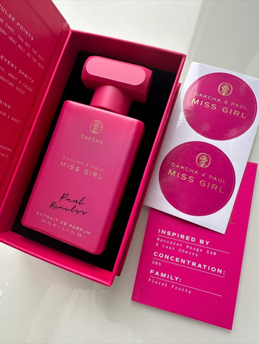 1000+Selling a bottle of OAKCHA X PAUL Miss Girl Extrait de Parfum. It comes in a 50ml (1.7 FL OZ) size. Inspired by Baccarat Rouge 540 & Lost Cherry. It has a concentration of 30% with a floral fruity family. It comes with the box
