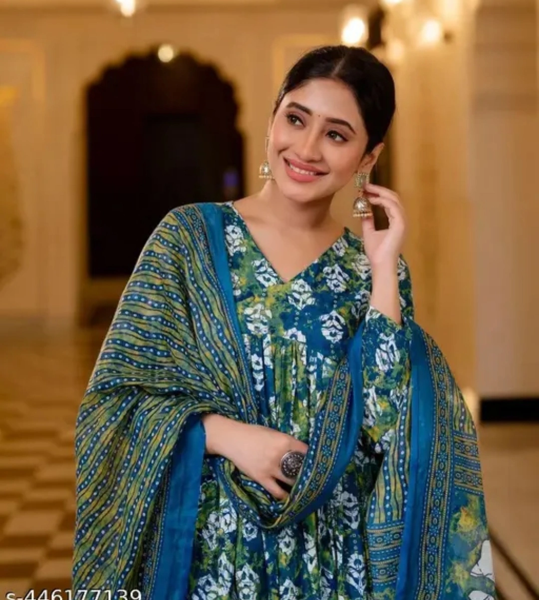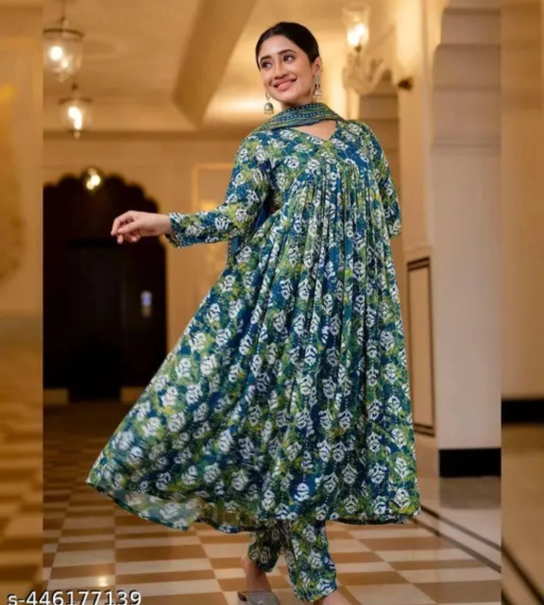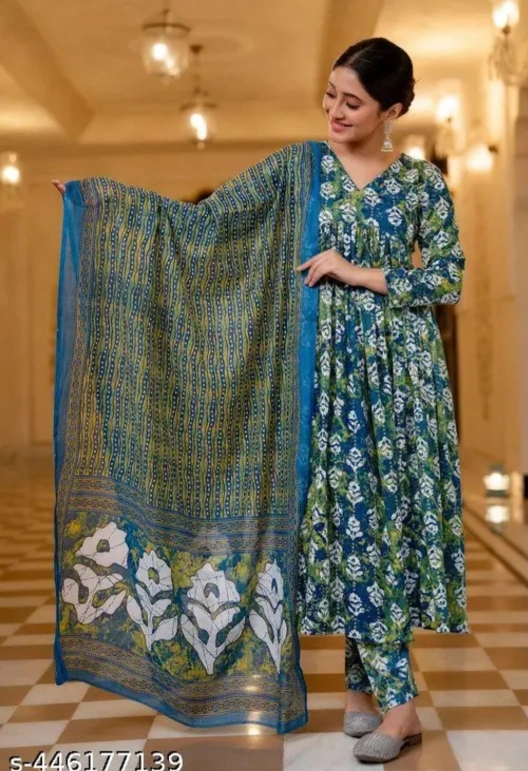 67This is a beautiful Anarkali Kurti set, perfect for a special occasion or just to add a touch of elegance to your everyday wear. It features a lovely blue floral print on the Kurti, which has a flattering V-neck design. The set includes a matching dupatta and pants, completing the look. It's in great condition and ready for a new home!