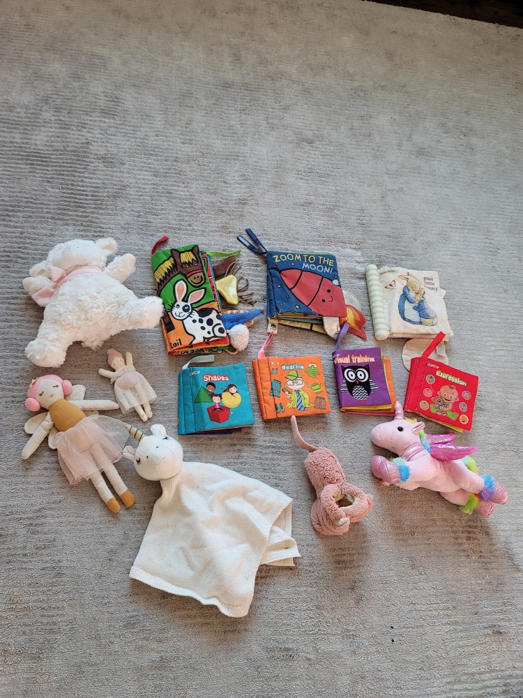 A collection of soft baby books and plush toys! Perfect for sensory development and early learning. Includes books with themes like shapes, expressions, and animals, plus a variety of cuddly plush characters.