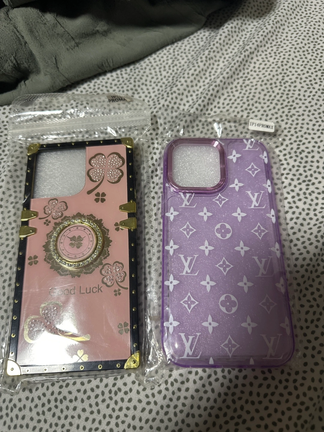 Selling two brand new iPhone 14 Pro Max cases! One is a cute pink case with a "Good Luck" design and clover details, and the other is a stylish purple Louis Vuitton pattern case. Both are still in their original packaging.