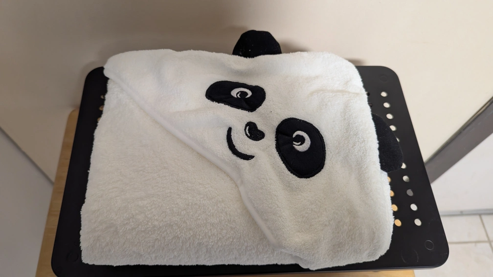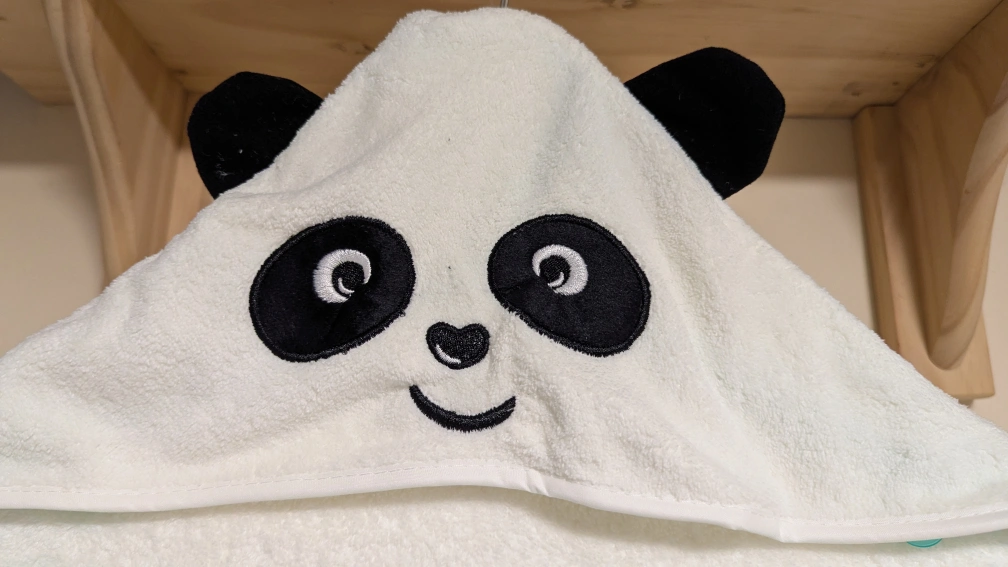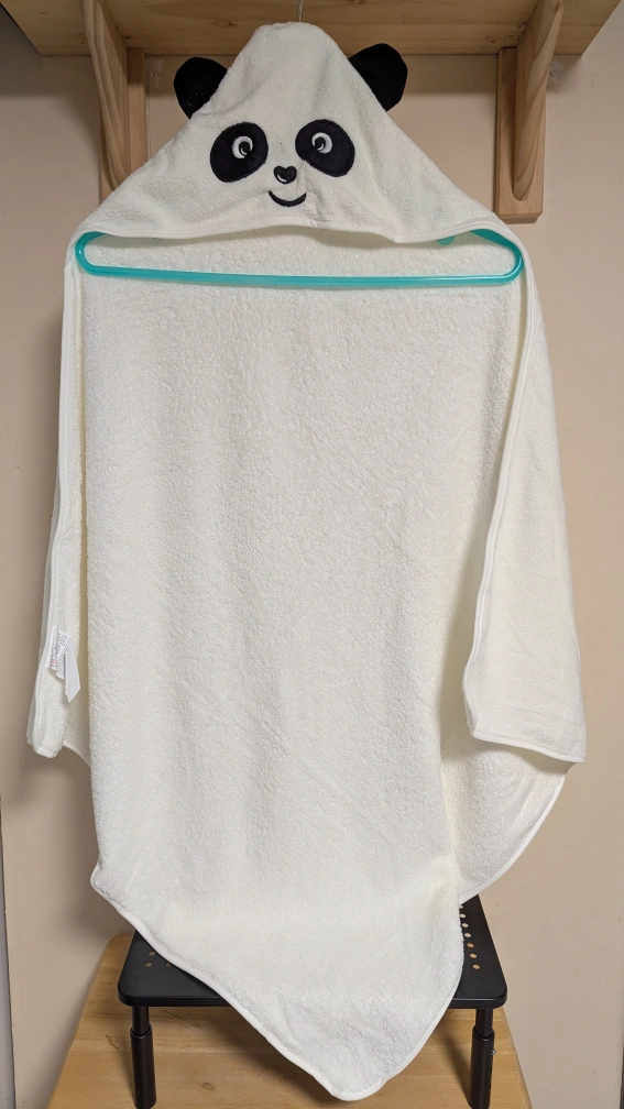 This panda hooded baby towel is just adorable! It's in great condition and ready to keep your little one cozy after bath time. The hood features a cute panda face with black ears and eyes, making it a fun and practical addition to your baby's essentials