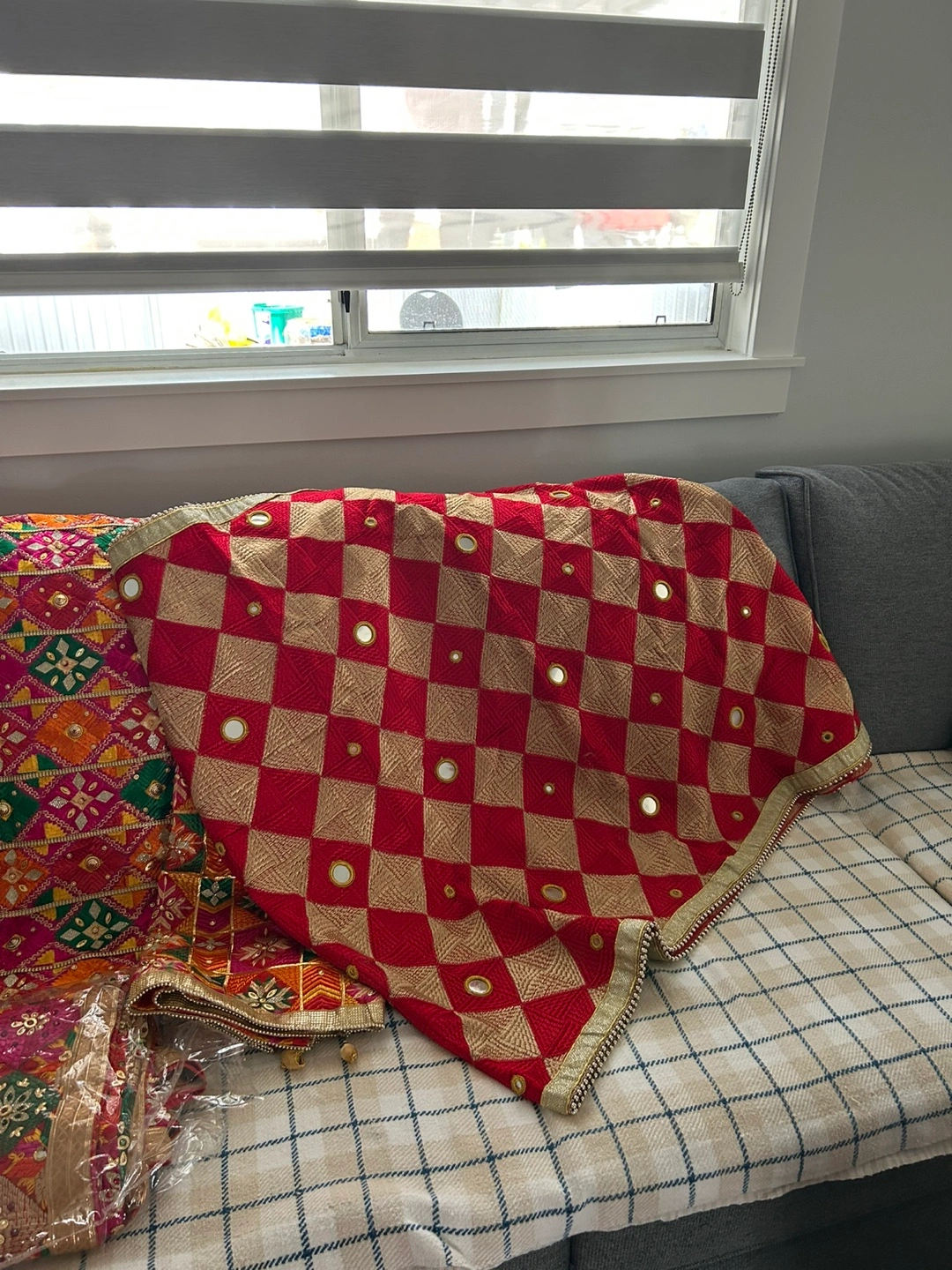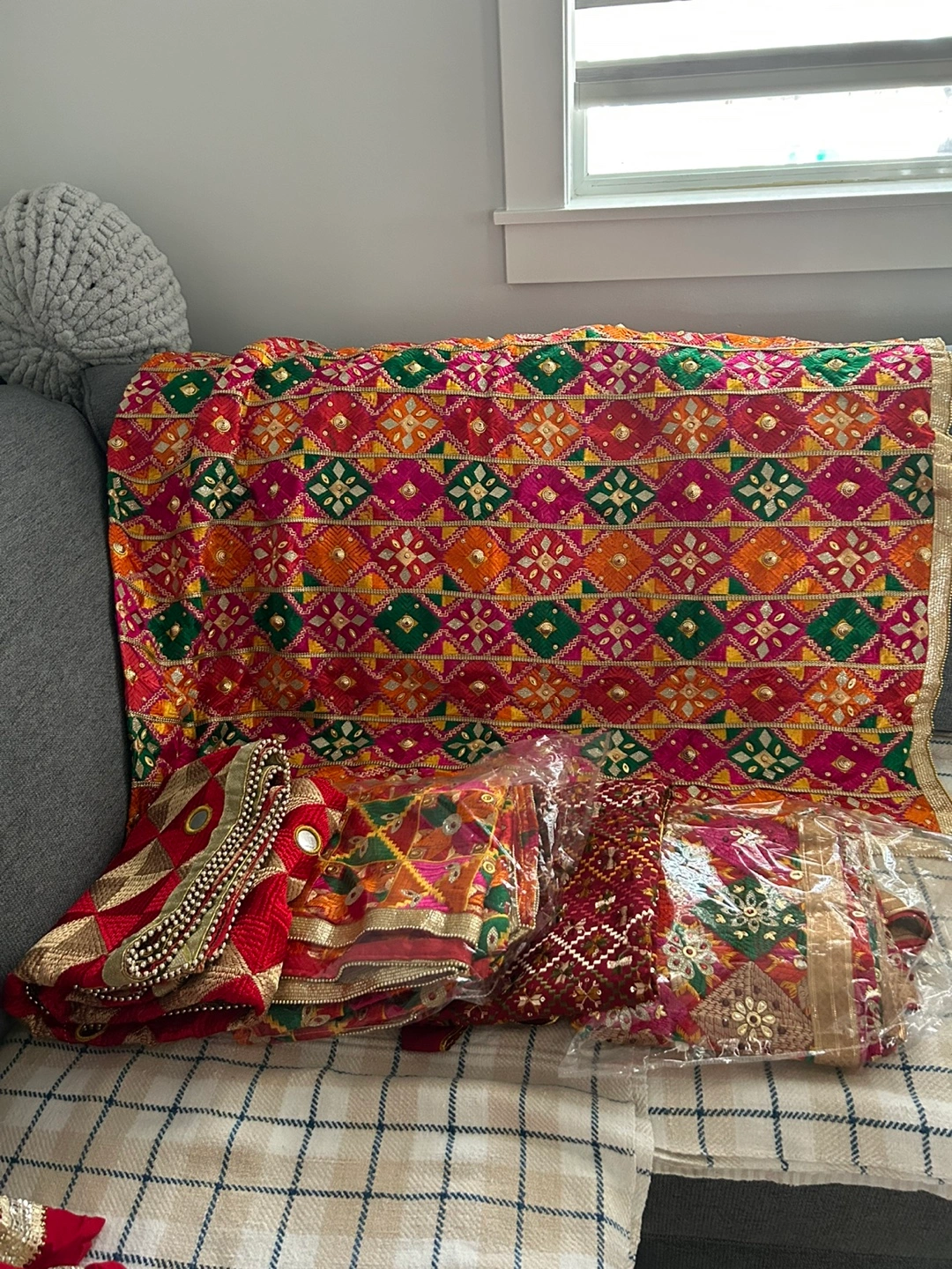 Selling a beautiful Phulkari for $25 each. This traditional Punjabi outfit features vibrant colours and intricate embroidery. Perfect for special occasions or adding a touch of cultural flair to your wardrobe. Bina and fans also available for sale. Make me an offer.