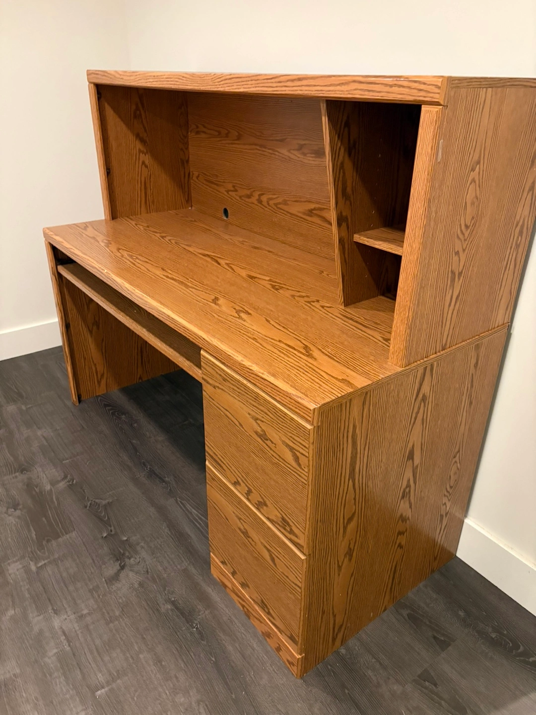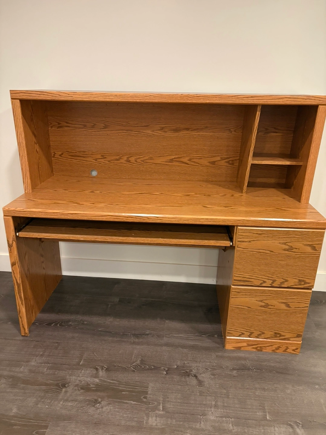 Selling a sturdy wooden desk with a hutch. It features a built-in keyboard tray and filing cabinet drawers for storage. Great for a home office or study space!